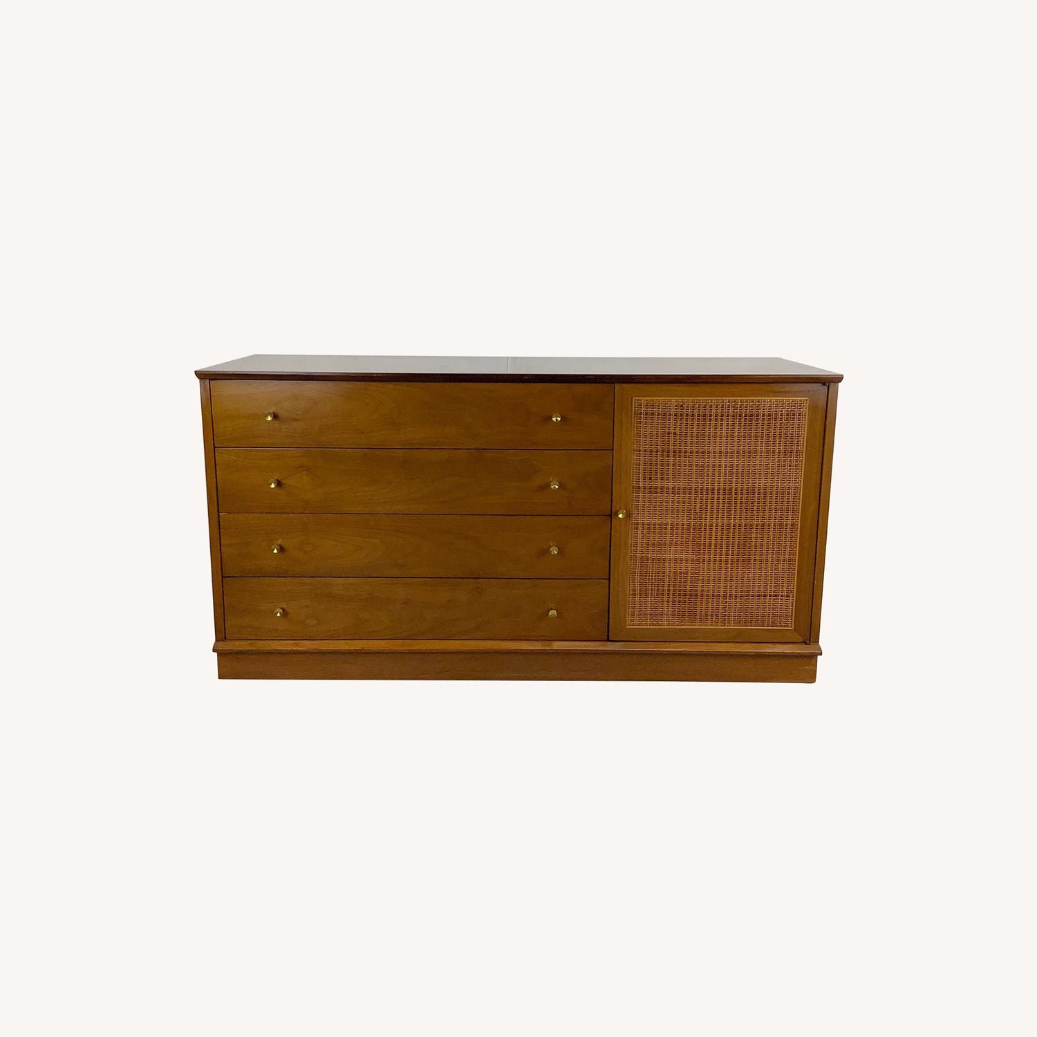 Seller's Notes:This striking vintage modern dresser or storage cabinet features a combination of a light wood tone finish with cane front cabinet door, offering four stacked drawers side by side with cabinet storage. The small foot print of this mid-century modern dresser with cabinet storage makes this danish modern style set of drawers the perfect addition to any interior. Matching cane front cabinet also available- Dimensions: 54w 18d 28h Condition: age appropriate wear, vintage finish worn, scuffs/scratches, edge wear, veneer chips, discoloration, interior marks, see photos.