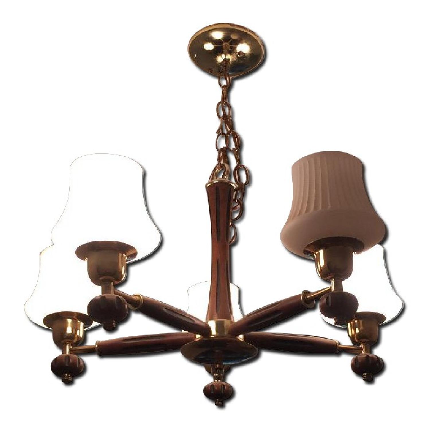 Seller's Notes:This is a really cool mid-century light fixture that has been here for 50 years! It's in perfect condition, has milk glass shades, a longer brass chain, carved wood. Really cool but doesn't fit in with our renovation!