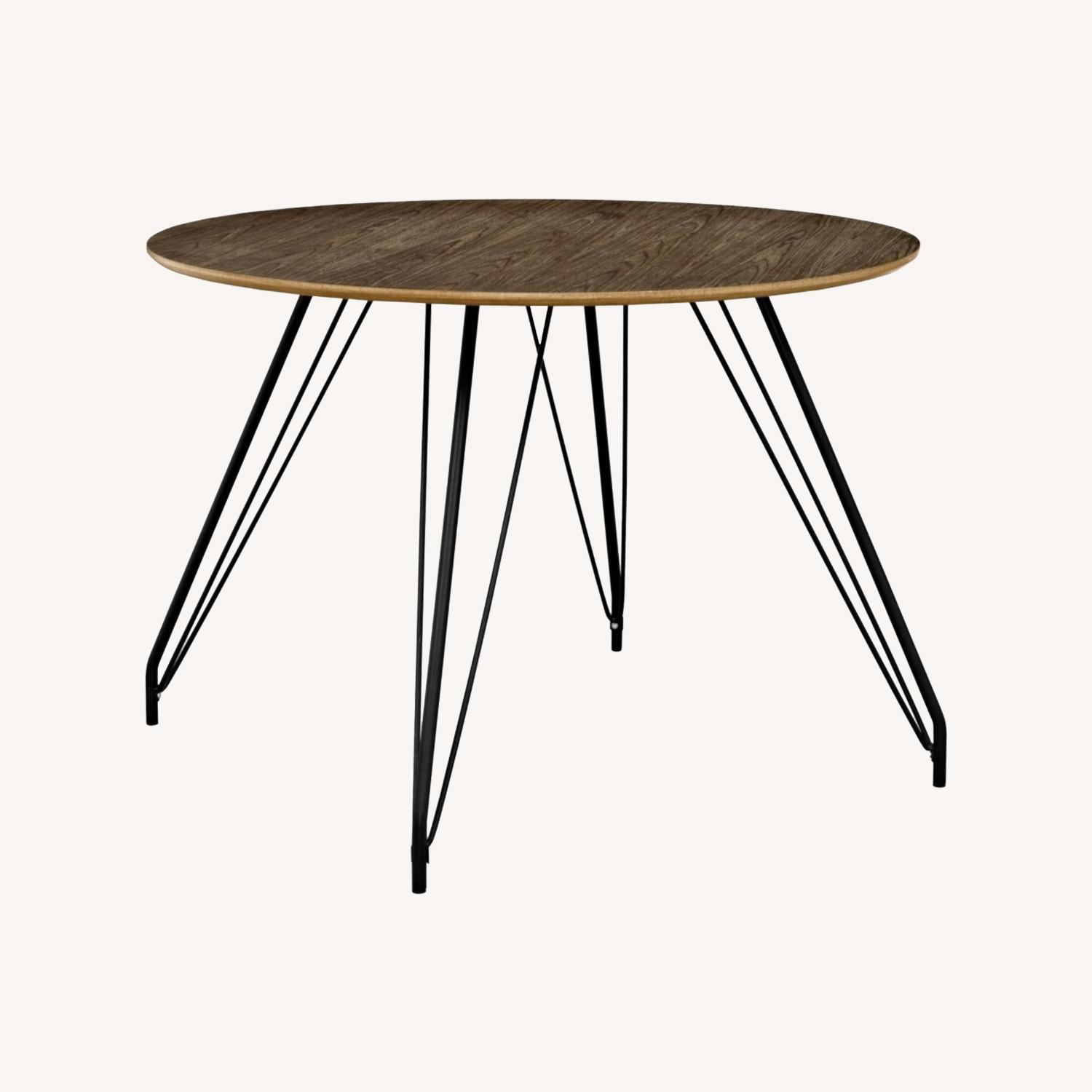 Seller's Notes:Table is 44“ diameter made of wood with metal legs + 2 chairs. Chairs are faux leather and wood. Very easy to maintain. Perfect for seating up to 4 people Chairs are similar to these: https://www.polyandbark.com/products/lando-leather-dining-chair?variant=31828697677897 Table is similar to this: walnut top/black metal legs