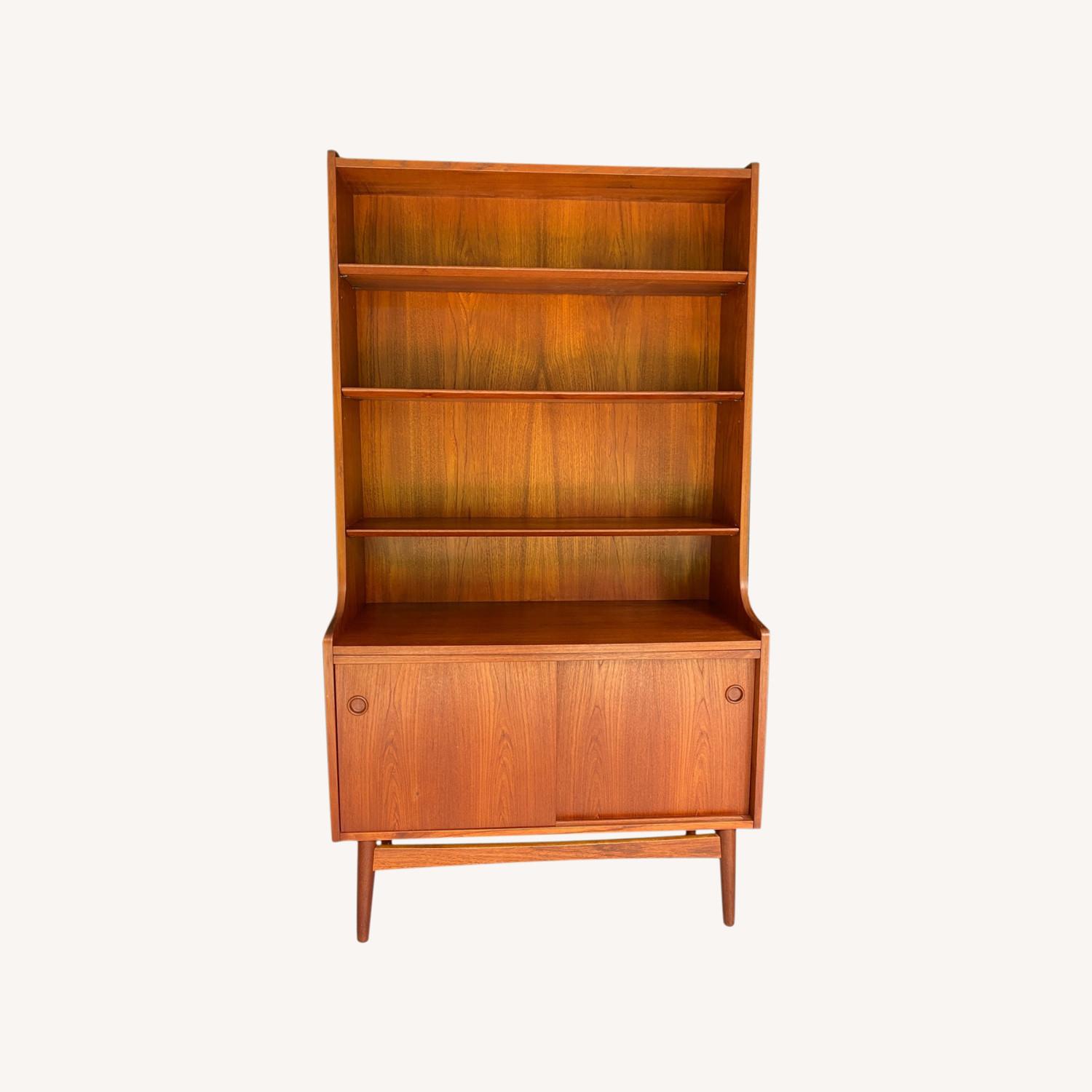 Seller's Notes:Perfect condition, Authentic vintage mid century Danish / Scandinavian Modern teak bookshelf | cabinet. No manufacture markings on the unit. No damage to veneer; really stellar condition. Measurements: 72" Height 39.5" Width 16.75 depth near base 17" at mid point on first ledge over cabinet. 10" shelf depth for the first shelf above cabinet. 9" for both shelves towards top of unit. Shelves are pegged for exact positioning inside the unit interior. Shelves inside the cabinet area at bottom are fixed.