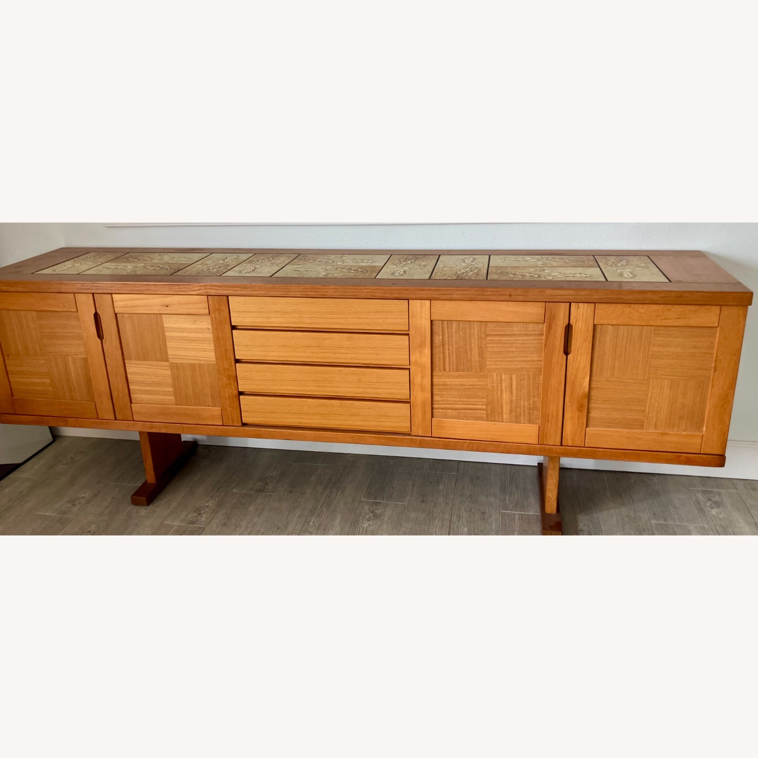 Seller's Notes:Rare sled base mid Century Gango Mobler teak credenza, absolute stunning statement piece, finished back and shelves, heavy, classic tiled top, and ready for a new home.