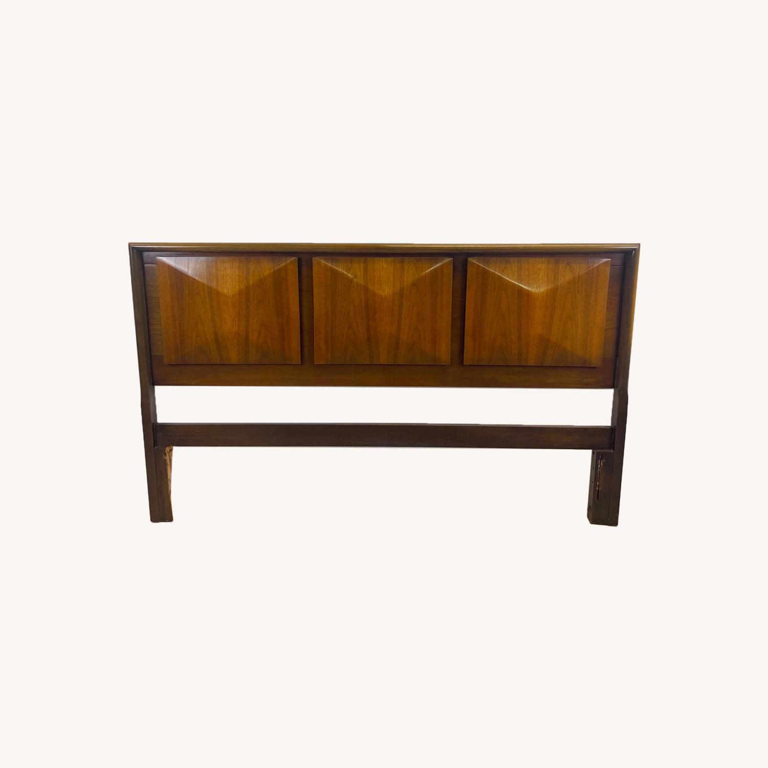 Seller's Notes:This impressive mid-century modern diamond front headboard features a warm vintage walnut finish and uniquely sculpted convex fronts. At 60 inches wide this was originally used with a full size bed frame but can be modified with additional hardware (not included) to mount to your existing full or queen size frame. Dimensions: 60w 2d 36h Condition: age appropriate wear, vintage finish worn, scuffs/scratches, edge wear, discoloration/finish loss, wood loss/damage, additional hardware/modification needed to mount to existing frame-see photos.