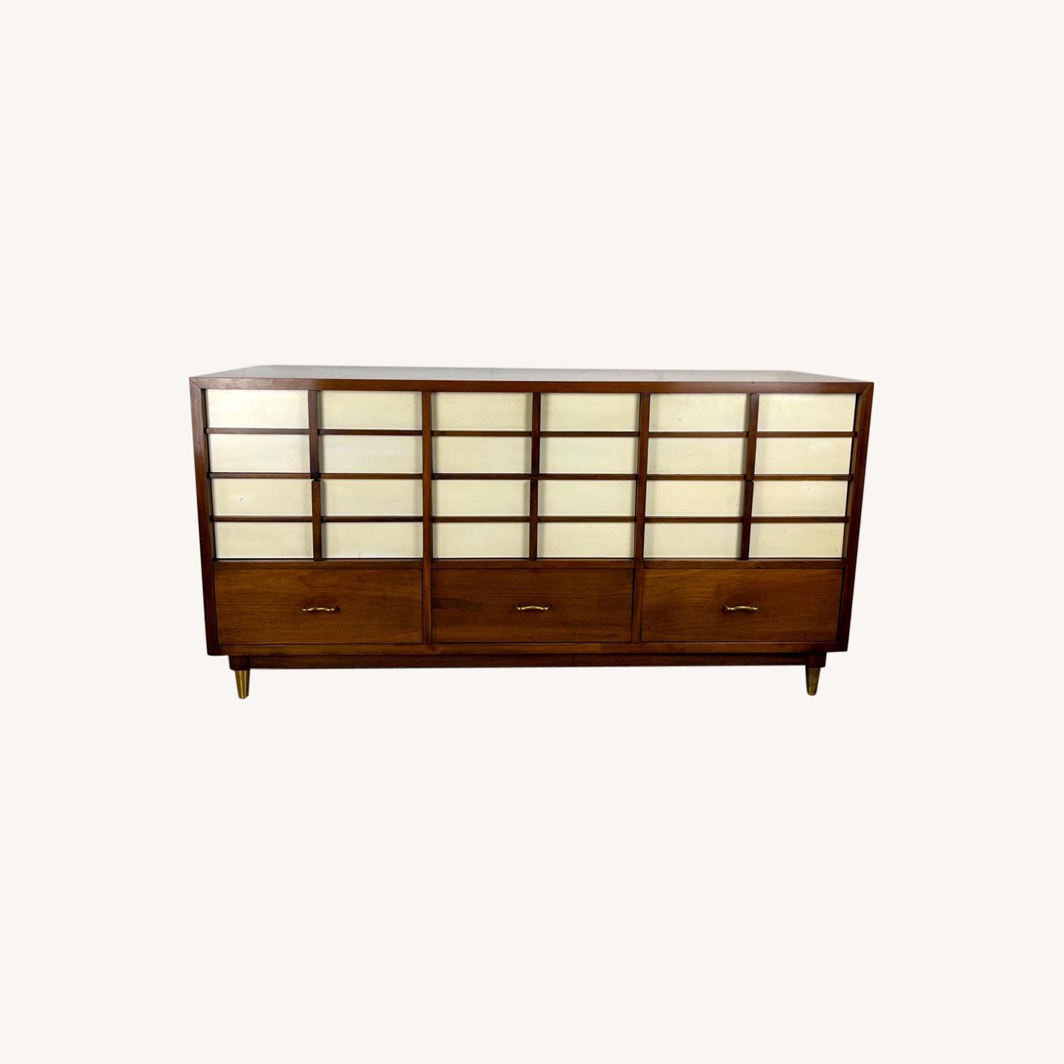 Seller's Notes:This wonderful vintage nine drawer mid-century modern dresser from American of Martinsvville features a two tone mix of walnut and cream color lacquer finish to create a pagoda style with plenty of clean modern lines. The vintage style of this mcm dresser makes it a memorable centerpiece to any bedroom. Dimensions: 60w 21d 31h Condition: age appropriate wear, vintage finish worn, scuffs/scratches, edge wear/chips, interior marks, discoloration, oxidation, see photos.