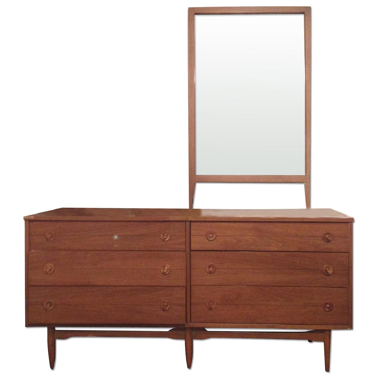Seller's Notes:Beautiful mid century modern walnut dresser. This dresser is in great shape, it contains 6 roomy drawers. All drawers open and close nicely and have matching wood knobs. Overall item is in good condition. Top shows some basic surface wear and has a small "chip" along the top edge which is barely noticeable. There are two wood knobs missing, on separate drawers, still able to open and close easily. Mirror has a matching walnut surround, measures 28"x46".