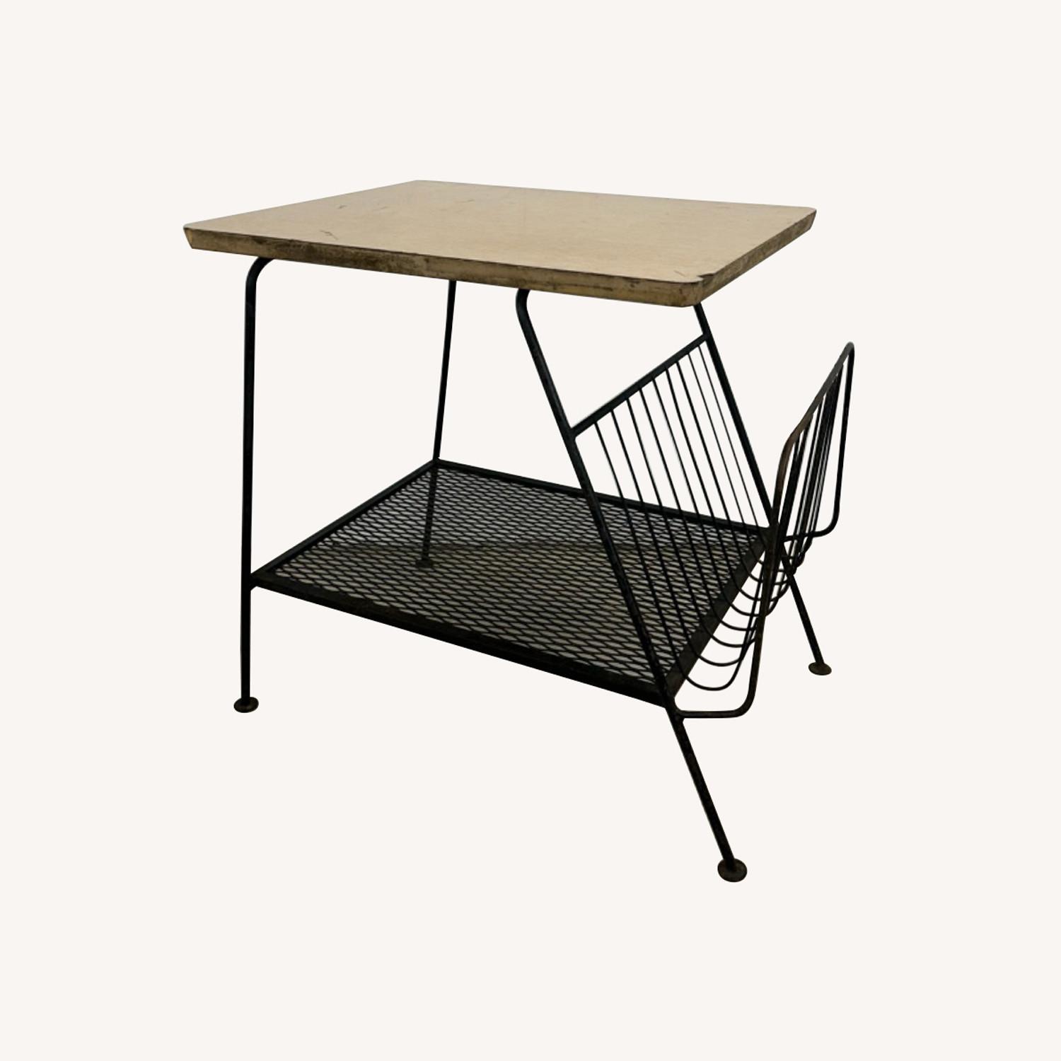 Seller's Notes:This mid century modern end table features durable Formica top with faux wood grain finish and black painted metal frame with built in magazine rack. Dimensions: 23.5w 16.5d 21.5h 20sh 28.5ah Condition: Formica top has some edge dings and deep scratches. Lots of cosmetic imperfections including scuffs, scratches and chips (see photos). Wire base is in excellent condition. Metal has slight oxidation and it could benefit from a fresh coat of black paint but is ready to use. Overall this table base would be worth restoring or possibly replacing with a hardwood top. But has many good years left in its current state. 7.5/10