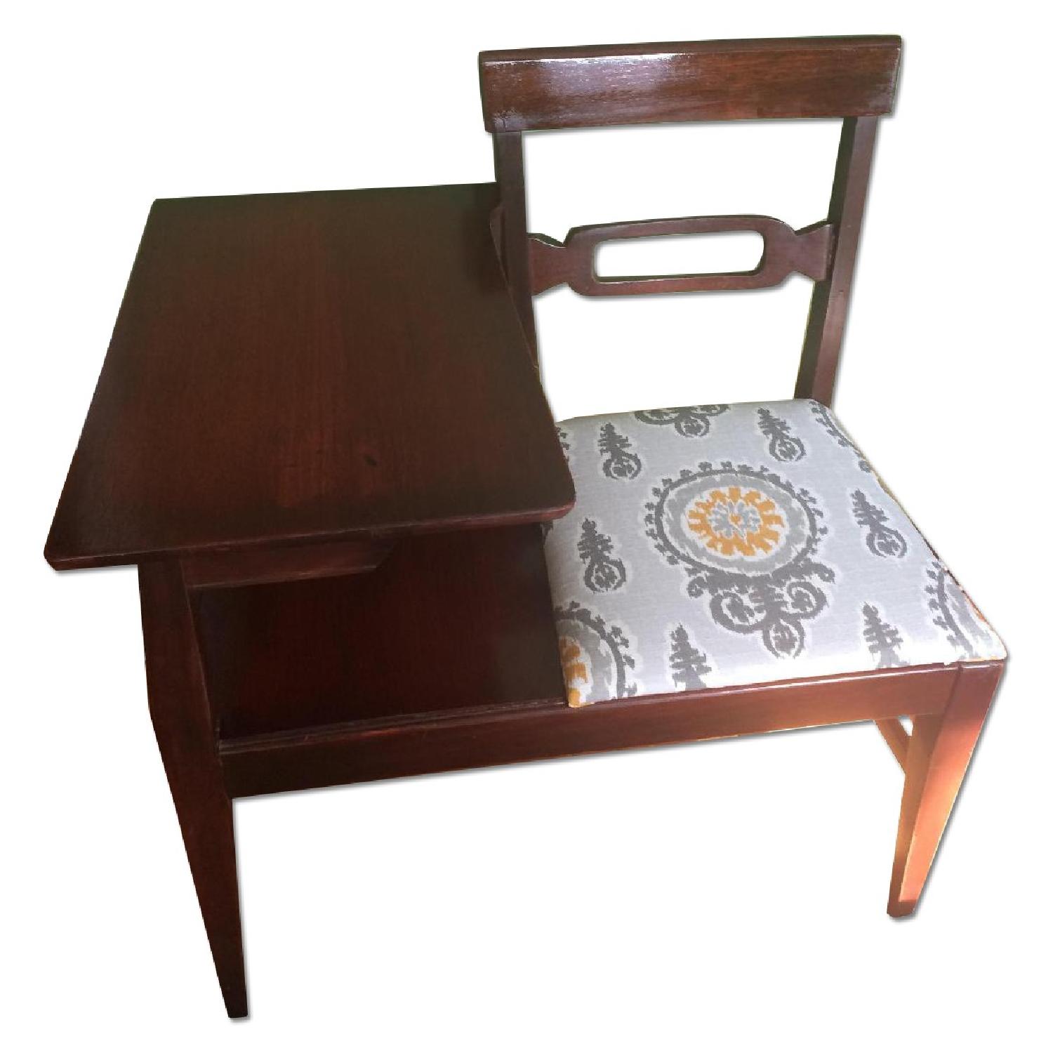 Seller's Notes:Awesome mid-century gossip bench (also known as telephone table) that would make a great addition to your home. Seating with a great shelf for storage. Wood is in beautiful condition, seat has been recovered.