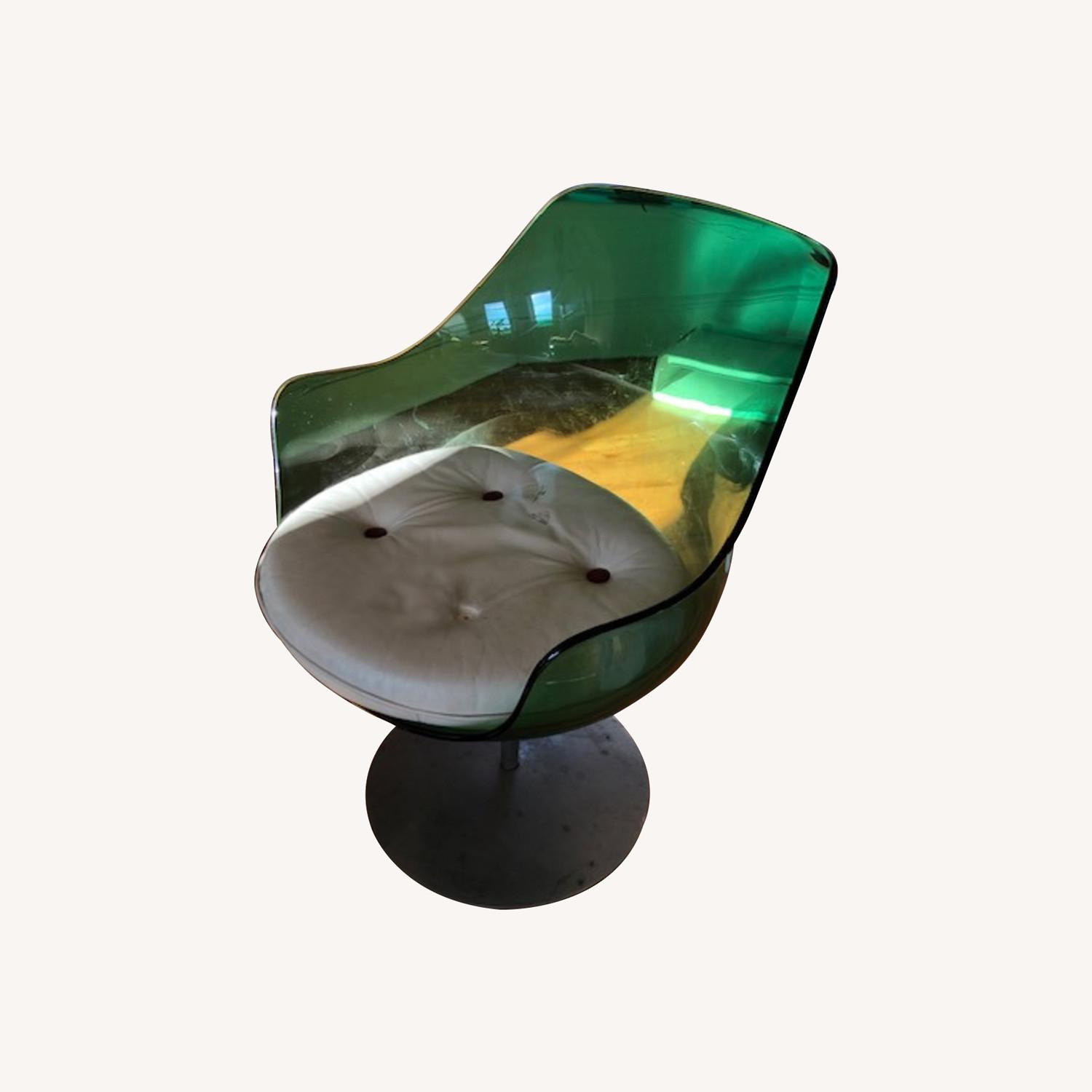 Seller's Notes:Green Champagne Chairs by Erwine & Estelle For Laverne International, 1959 Very cool molded chair in green plastic. Metal base. Seat cushion in pleather missing one button. A few small scratches but overall good condition. This mid-century modern dining room "Champaign" chair is designed by Erwine & Estelle Laverne for Formes Nouvelles in 1957, USA. This organically shaped piece is made of a green molded perspex seat on a polished aluminum base, Inspired by Saarinen's earlier "Tulip" chair, the Champaign is part of the Laverne's "Invisible Group". The slender pedestal base and translucent shell give the design a visual lightness and timeless sophistication. 24” wide 31” tall 18” seat height with cushion
