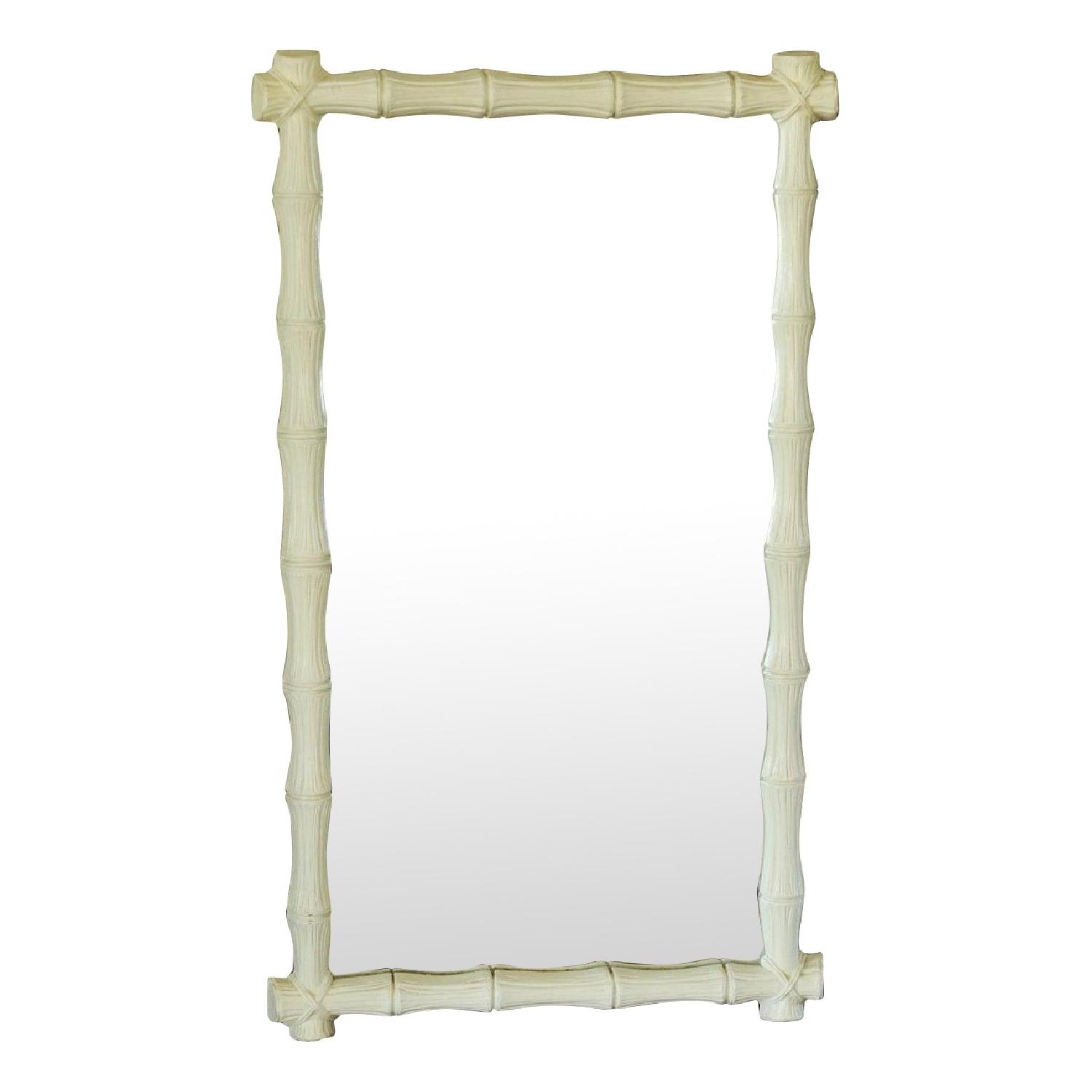 Seller's Notes:Great looking MCM Faux Bamboo Tiki Style Hollywood Regency Wall Mirror! Total size is approx. 19 inches wide x 33 inches tall Slightly off-white finish thick faux bamboo frame with corner ties Overall good vintage condition, mirror has a couple of age spots and areas of fogging circles-see pics. More or less noticeable depending on angle/lighting. Very sturdy and heavy Composite wood or heavy molded plastic frame Hangs vertically, could be converted to horizontal