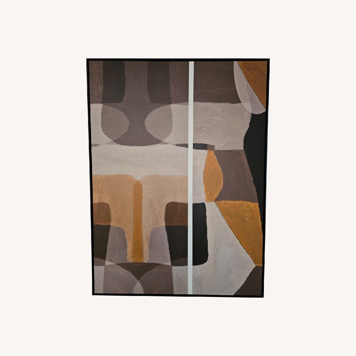 Seller's Notes:Like New, Mid-Century inspired wall art. Art is a mix of shades or oranges and browns. Oversized wall art piece measures approximately 43" W x 58"H x 1.25"D. Dark brown wood frame, carnvas artwork is inset.