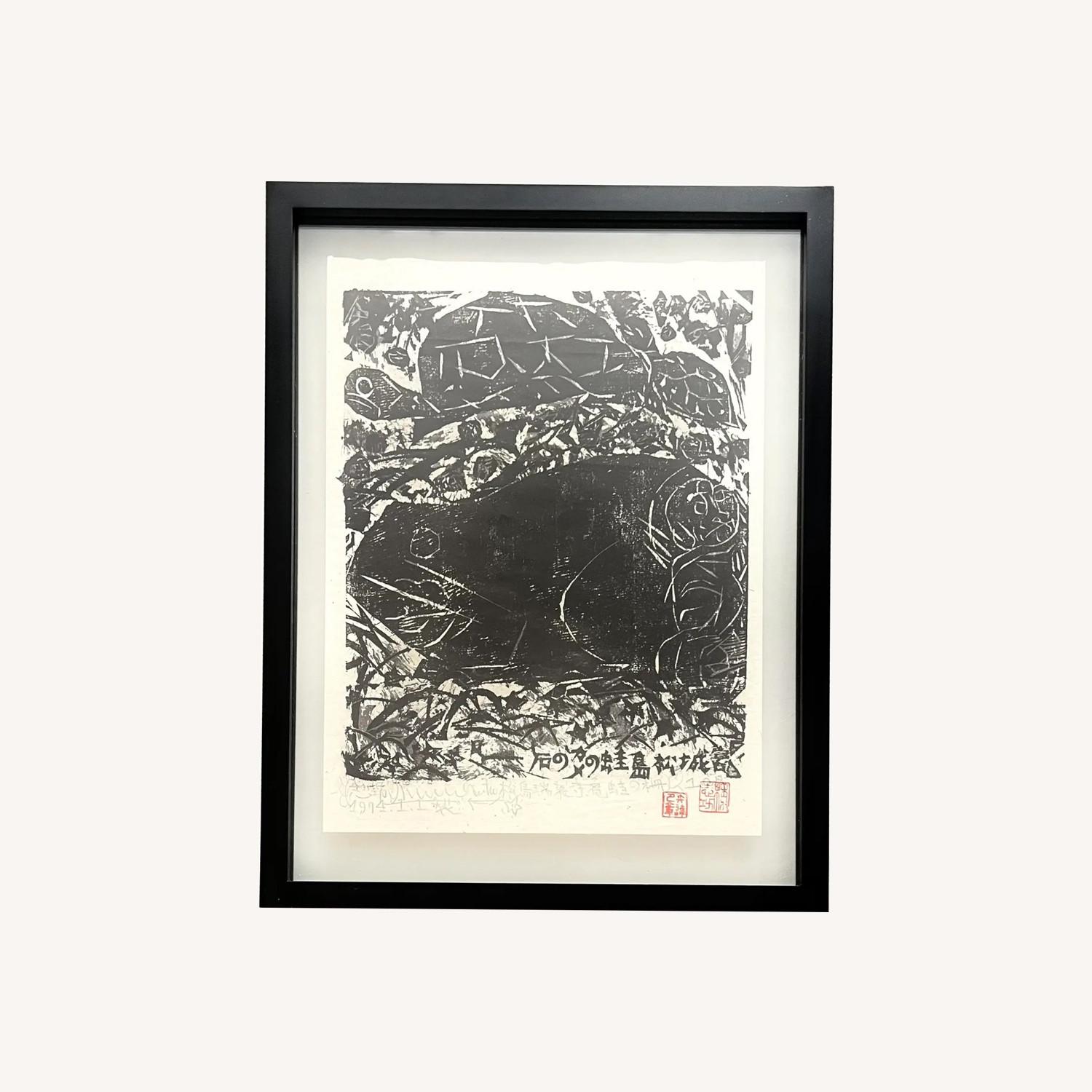 Seller's Notes:This mid-century Japanese woodblock lithograph print by Shiko Munakata hails from the 1970s. It depicts a fantastical "monster frog" in an abstracted forest / landscape. The story was that on assignment in a "wild landscape" in Japan, through his binoculars, he spotted a large stone sculpture in the distance which he originally labeled "a monster". Upon approach it was clear that it was a hig stone frog. Shiko Munakata was a woodblock print maker and visual artist of acclaim. He was associated with the Sosaku Hanga movement and the Mingei (folk art) movement. Presented under glass in a gilt toned wooden frame. On rice or mulberry paper in a glass and black metal floating frame. The frame measures approximately 15" x 19". Note: this is presented under glass in a floating frame which is clear, the primary photo of this listing uses a white background on the edges of the print but it is clear glass with black metal trim.