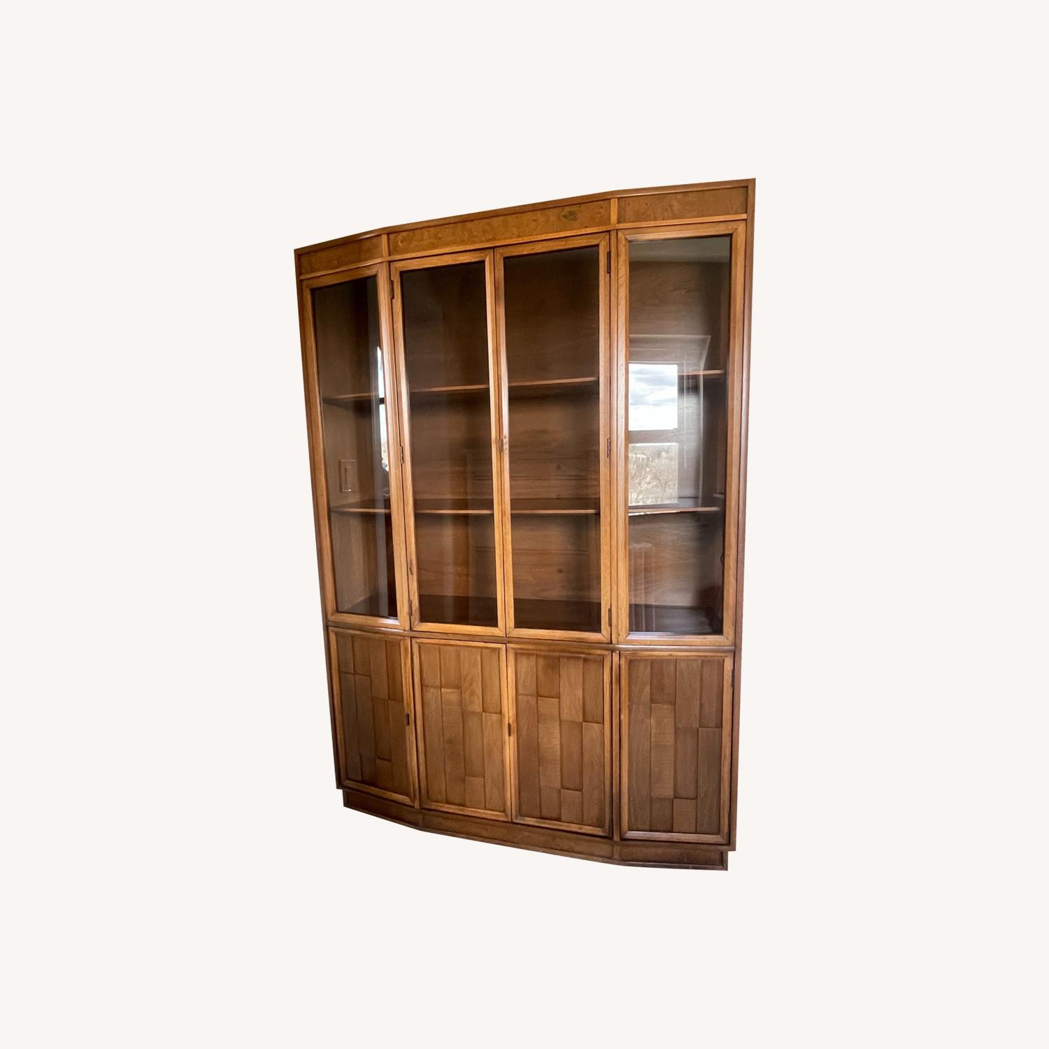 Seller's Notes:Vintage 1960's Kroehler Mid-Century Modern one-piece china cabinet Glass middler doors open up top and there are two wood shelves Middle bottom doors open and there are 3 drawers inside Really great vintage condition. Missing pull on left cabinet as shown in last photo but can still easily open. Has a few light scratches as seen in the photos.