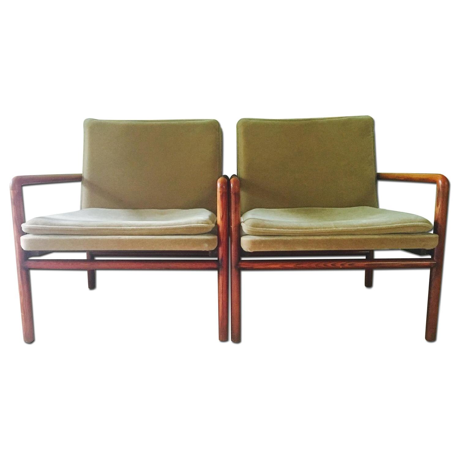 Seller's Notes:With this handsome pair of mod loungers, you get some authentic mid century arm chair chic. Solid beechwood construction with camel / sand tone upholstery. Sears are 15" off the ground. Excellent accent chairs that will help you decompress after your long madmen days at the office.