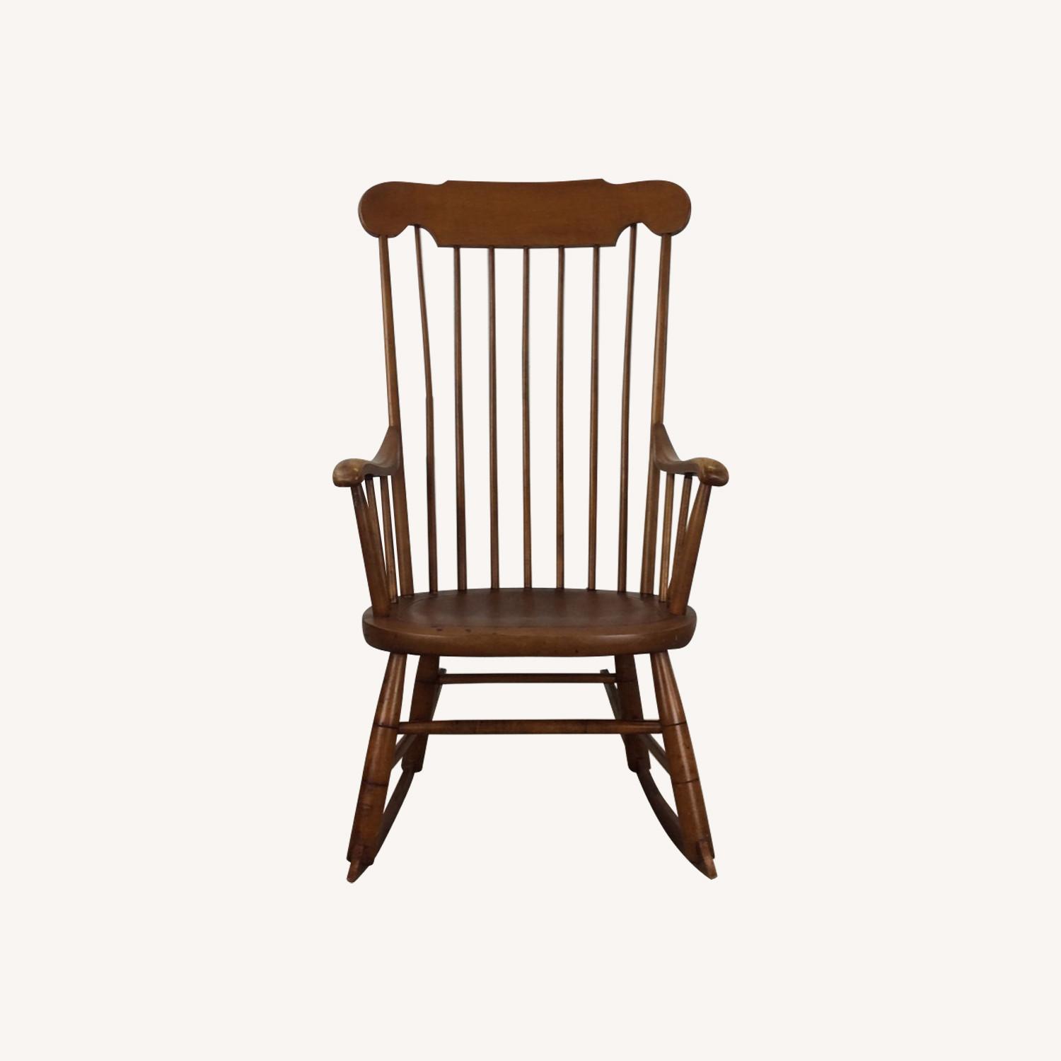 Seller's Notes:This mid century rocking chair features solid maple construction, original maple finish, high back design with rounded spindles, and uniquely shaped arm rests. Dimensions: 23.5w 31d 43.5h 16sh Condition notes: Excellent condition with minor scuffs and scratches. Some light fading and discoloration in the finish on the arm rest. Small cosmetic imperfections on seat and base. Overall a very sturdy chair and a very comfortable rocker. 9/10