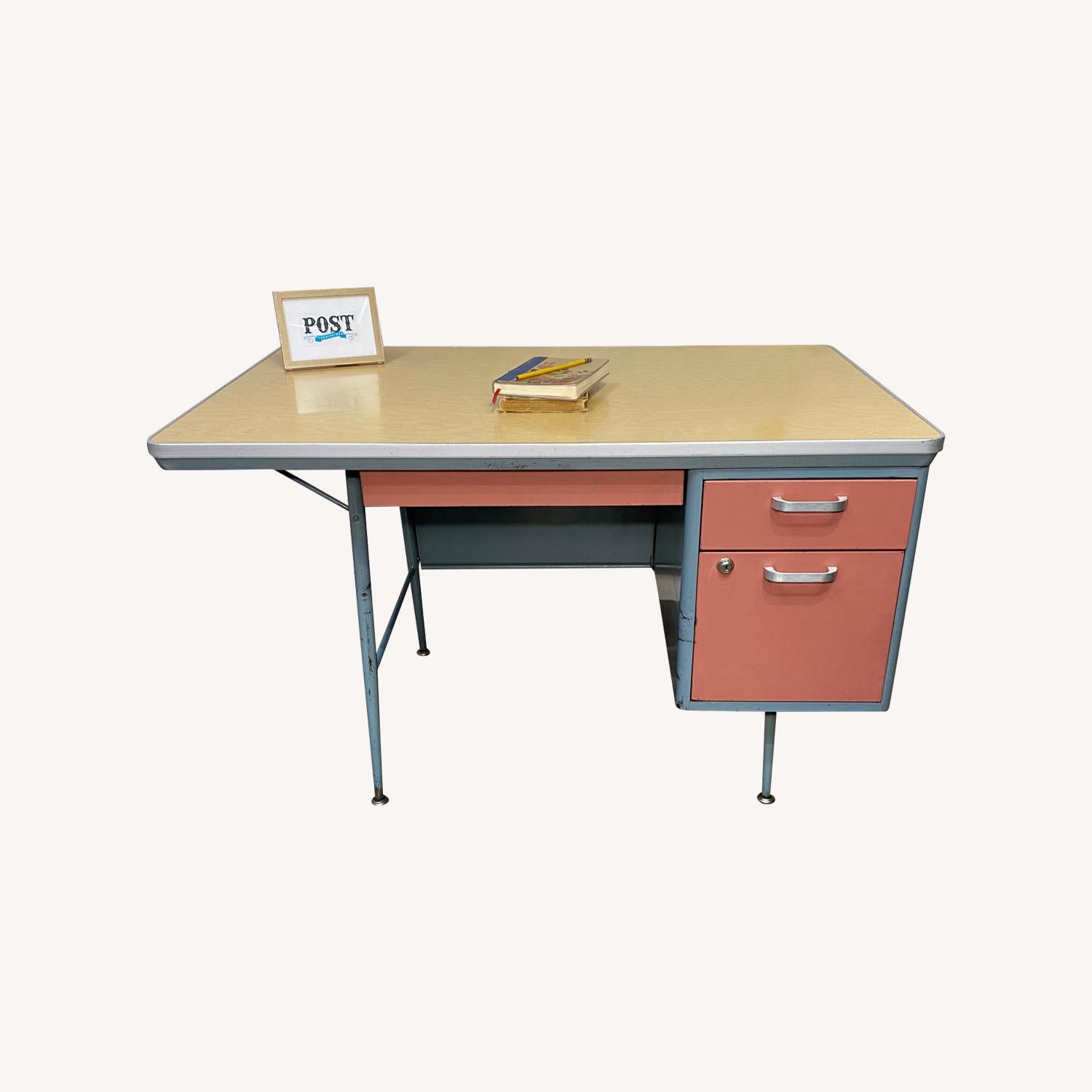 Seller's Notes:Mid century modern metal teachers desk. Original color and condition. Very sturdy and durable. See pics for scuffs and scratches. All drawers work properly. Width - 48” Depth - 30” Height - 29” Chair opening width - 21.5”