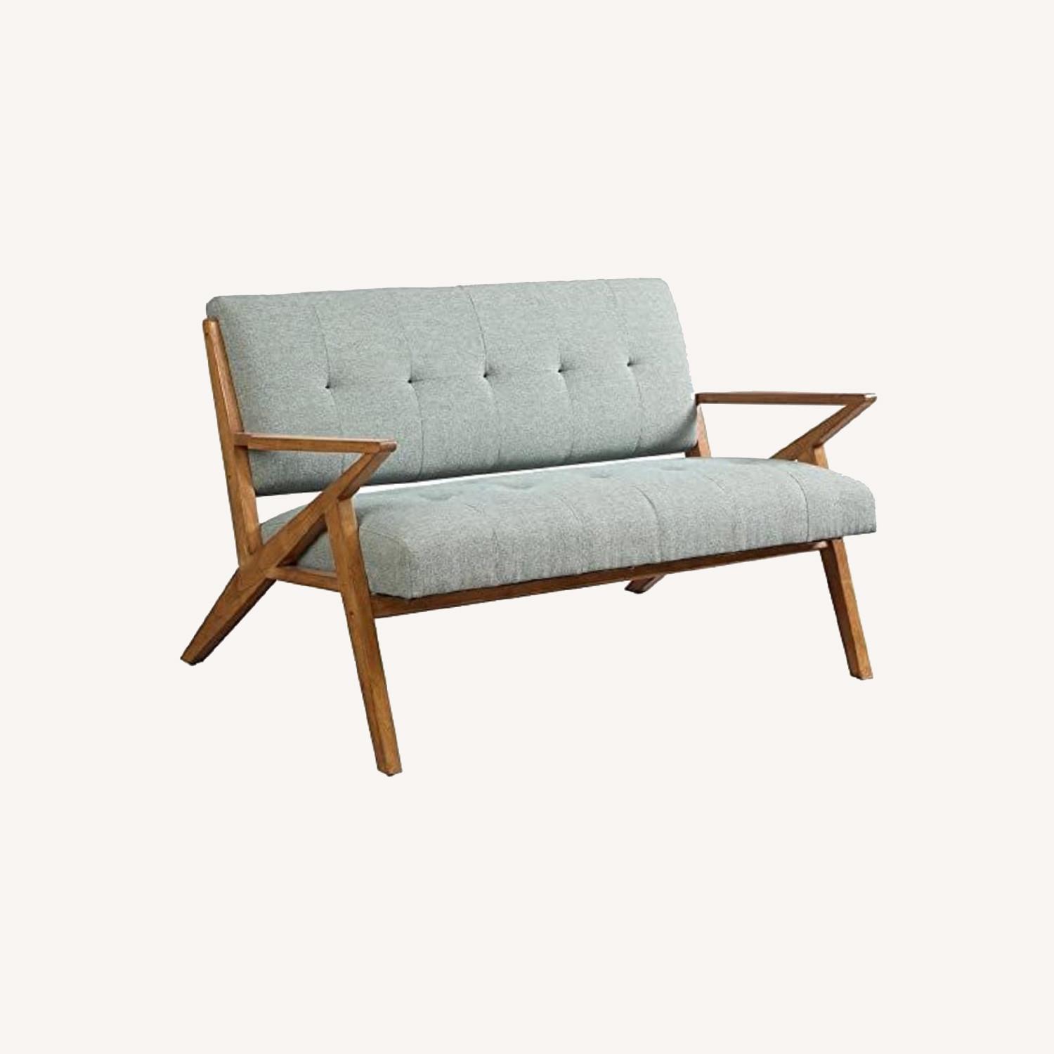 Seller's Notes:Solid walnut legs and light blue woven fabric. Seats 2 people comfortably. Great condition—a few small scratches on the legs but the textile is like new! This sofa has received a lot of compliments in its lifetime and still has so much life to live! We recently upgraded to a larger sectional and no longer have room. We’re also selling the accompanying chair which we’d be happy to throw in for another $200