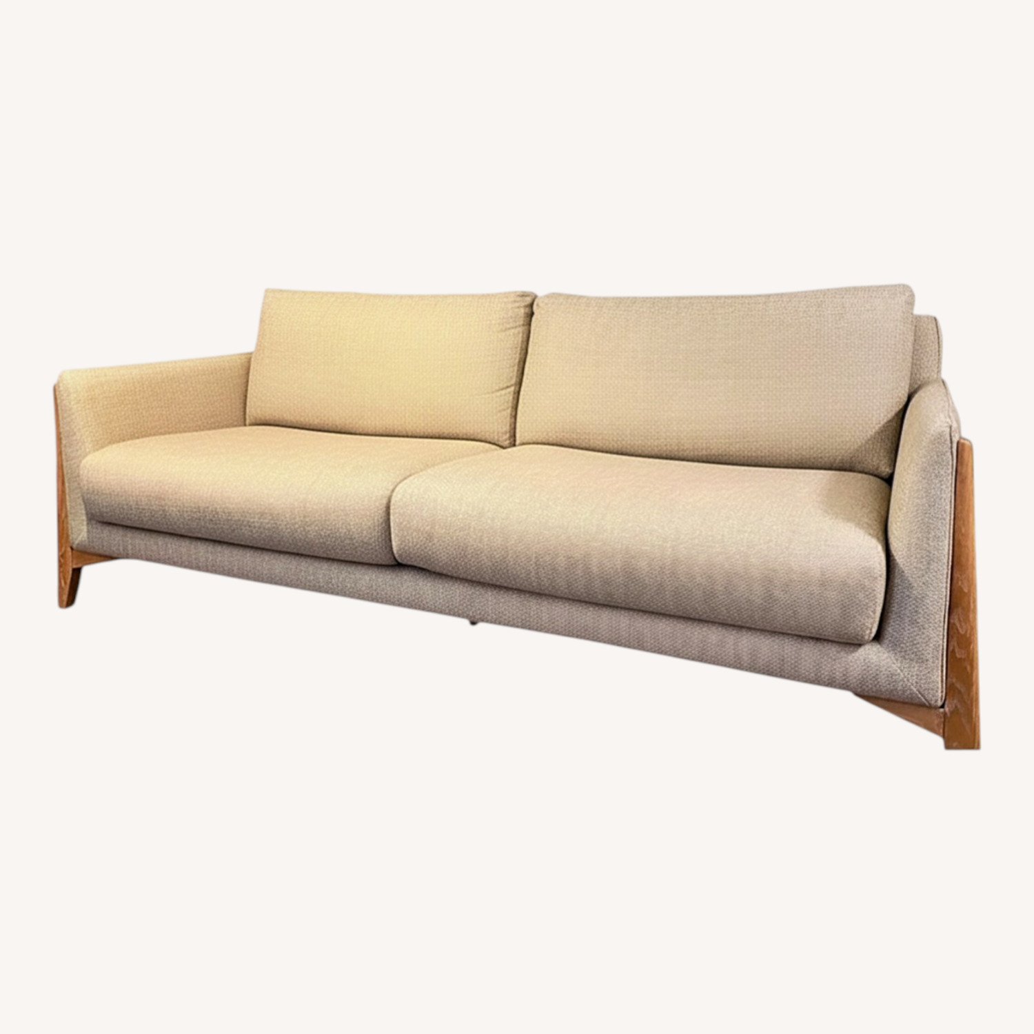 Seller's Notes:Selling our gorgeous mid-century modern sofa. We are moving and sadly can’t take it with us. We bought it for $2400, selling it for $350. Details: ∙ 3-seater, light oat/beige woven fabric upholstery ∙ Solid wood frame legs and side panels ∙ Dimensions: 80 * 32 * 35 ∙ Excellent condition - we used just under two years, zero visible wear or staining