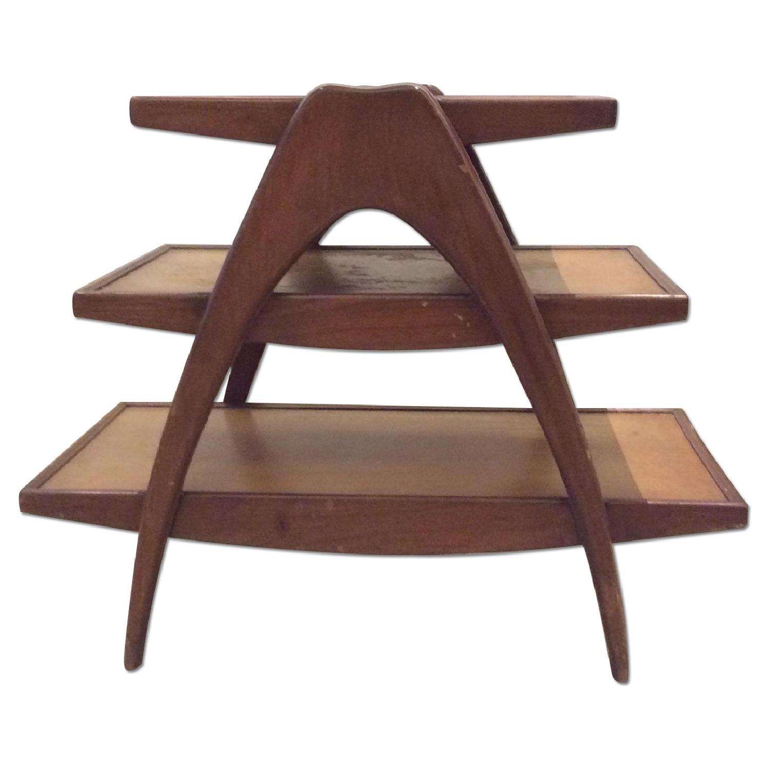 Seller's Notes:This item was inherited and has been in storage for the last 40 years. It is an unusual design with 3 shelves and two wood tones: Top shelf measures 19"x16", middle shelf measures 26" x 16" and bottom shelf measures 32" x 16". There is approximately 6-7" height in between the shelves. Solidly made but has peeling finish on the two lower shelves, so should be lightly sanded and new poly applied.