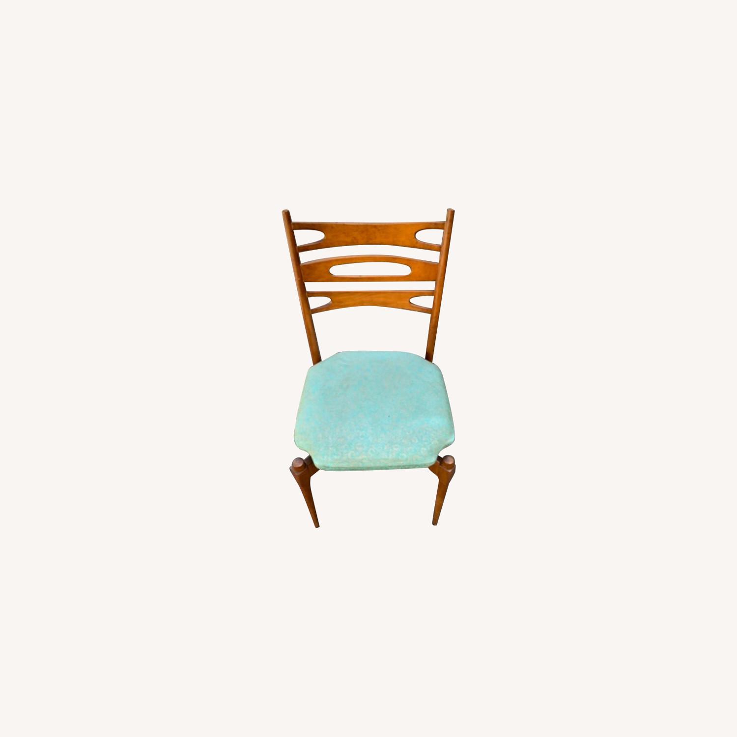 Seller's Notes:Real Mid Century 4 piece dining chair set made by Hale of Vermont circa 1960’s. This is an original, excellent condition set. Bottom of each chair indicates the Style which was called “Iriquois” as well as Seat cover fabric which is a turquoise fabric with a faint gold swirl pattern. Solid wood on all parts. The seat construction is such that the seat appears to almost float above the base. Dimensions are as follows: floor to top of the highest post is 36.5”. Width across the back of the chair is 17.5”. The height from floor to the seat is 17”. And the seat cushion itself measures 19” x 19”. The Hale Company of Vermont made high quality solid wood furniture from the late 1800’s thru it’s closure in the 1990’s. They are mostly known for more traditional/ colonial pieces so this design is fairly unique.