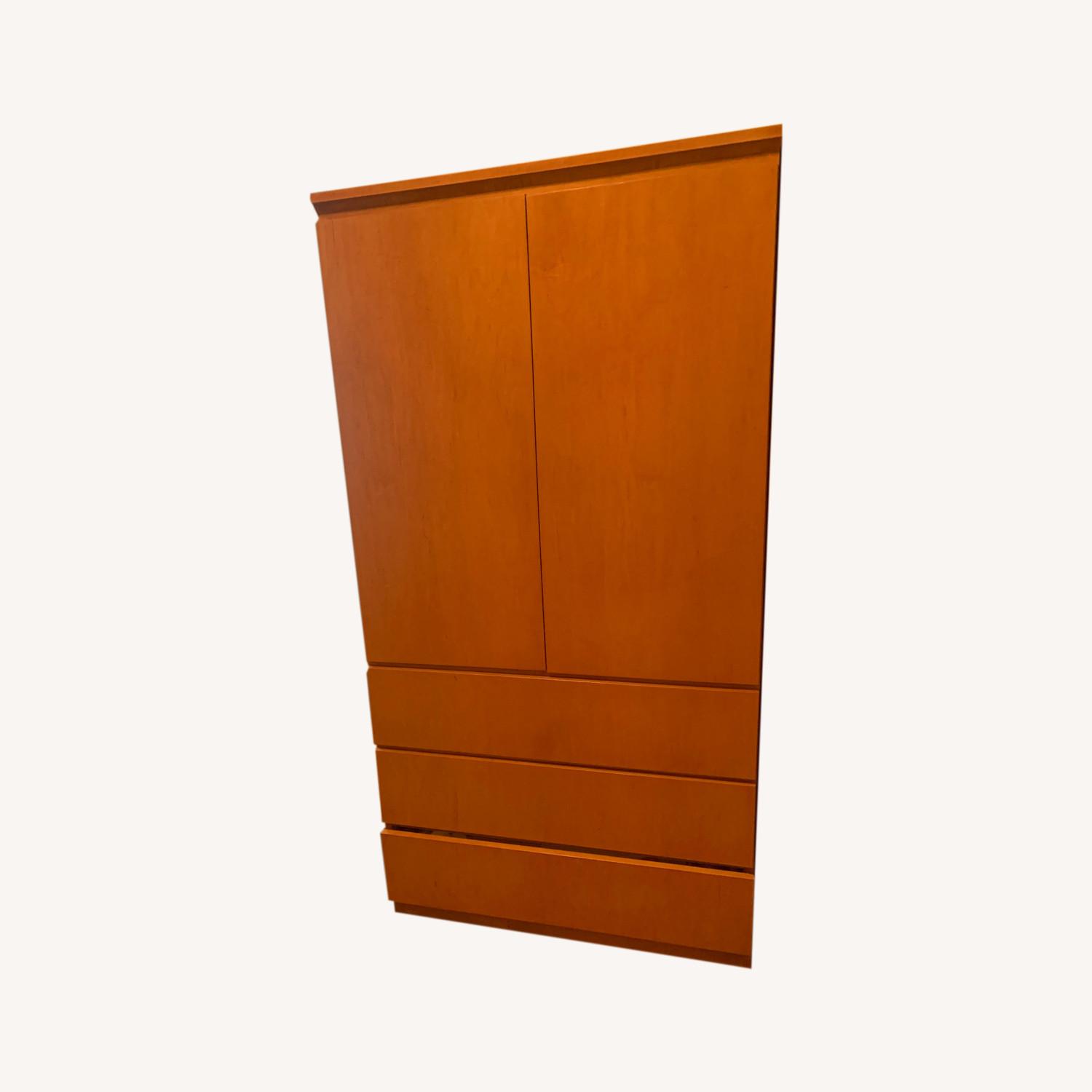 Seller's Notes:Hand Built on Demand. Wold Cherry Stained The Mid Century Modern Collection is designed with both modern minimalist style and extreme storage capability in mind. Straight lines, square edges, flat drawer fronts, and a subtle crown top help accentuate the sleek elegance of this line. The Mid Century Modern Armoire with 2 Shelves comes with 3 large drawers and 2 adjustable shelves behind the doors. All drawers in the Flat Shaker collection come equipped with metal tracks for ease of use when opening and closing the drawers, and Flat Fronts with grooved edges underneath which help add to it's sleek modern style. Behind the doors is a large open space with two adjustable shelves that allows the folding and storing of clothes, linens, or other accessories. Handmade with REAL solid Birch Plywood and REAL Birch Wood Veneer Edging.
