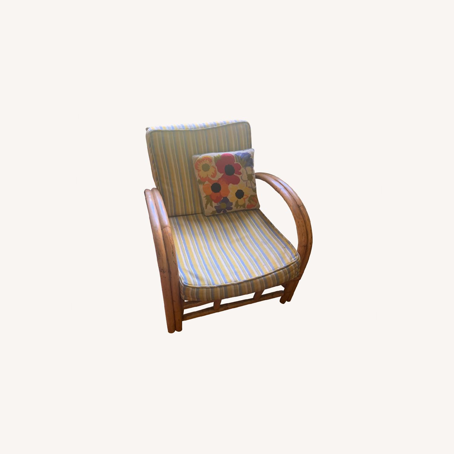 Seller's Notes:Mid century bamboo rattan arm chair with 2 striped cushions included. Wood is in good vintage condition. Purchased from original owner in the 1970s & has lived in a smoke & pet free apartment ever since. Price is for ONE armchair Two are available for sale.