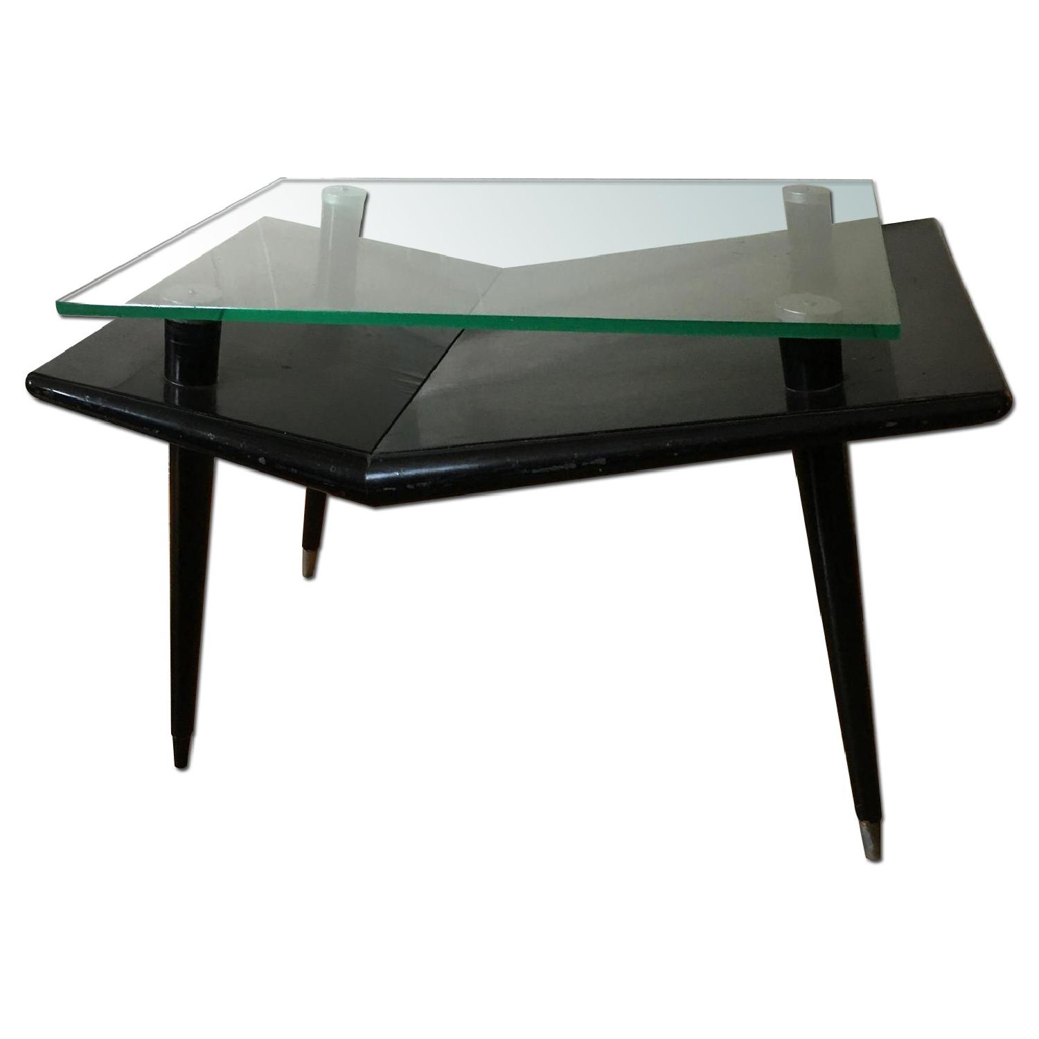 Seller's Notes:This is a great mid-century modern black atomic wood side table with a glass top. It has an angled base that really makes it pop. It shows a bit of wear due to age but is in pretty decent shape. it is missing the metal cap on one of the back legs but it is not really noticeable.