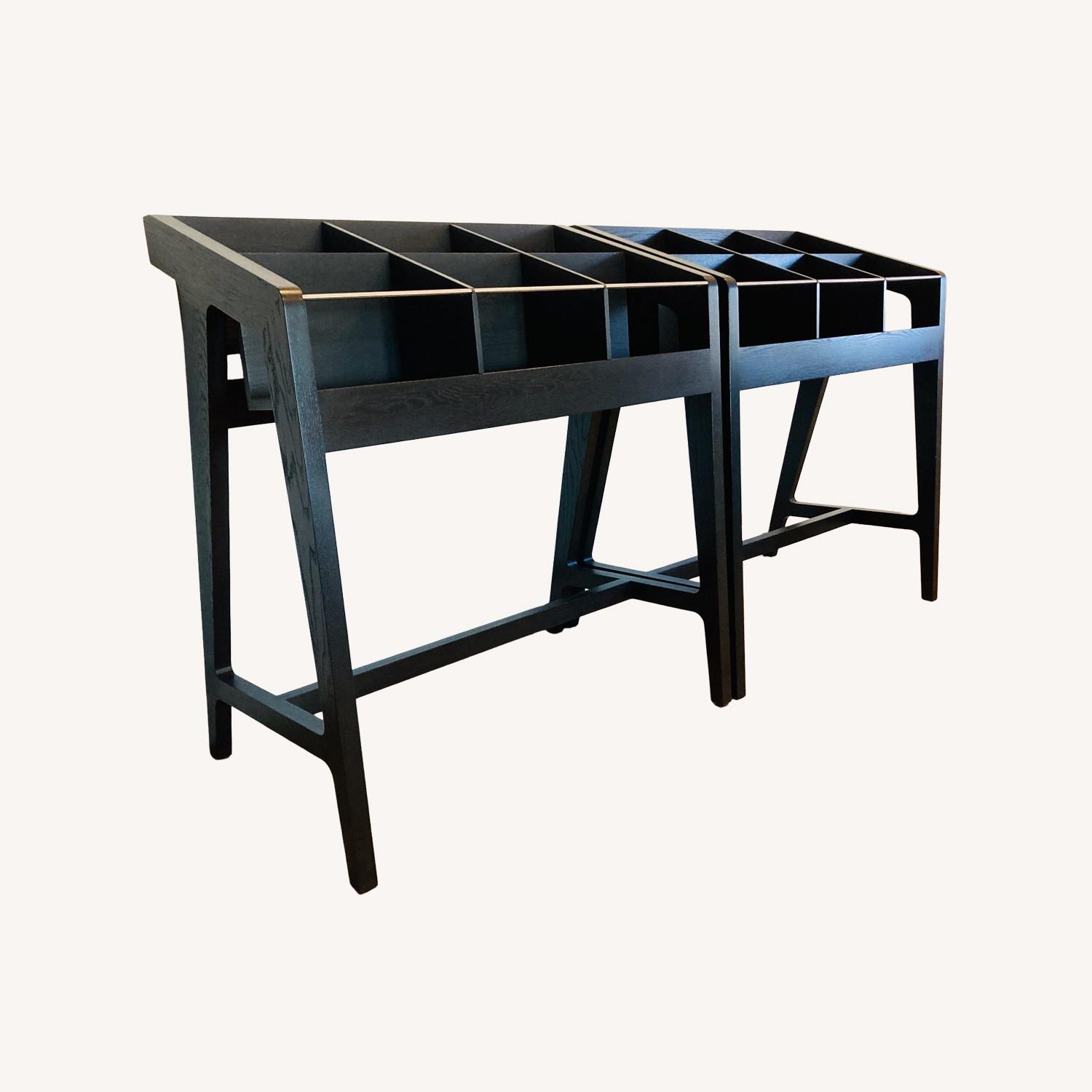 Seller's Notes:Pair of Custom Record Displays by Kai Takeshima Mid-century modern record displays crafted from blackened oak with stainless steel detailing and signature angled legs. Each stand has 6 compartments. Each compartment is about 13" in width and 9" in depth. The shelves are tilted at 6 degrees to ensure secure resting position of records. Total capacity per stand is up to 180 records. Exceptional craftsmanship from furniture designer Kai Takeshima (see portfolio: kaitakeshima.com/works/record-display-i).
