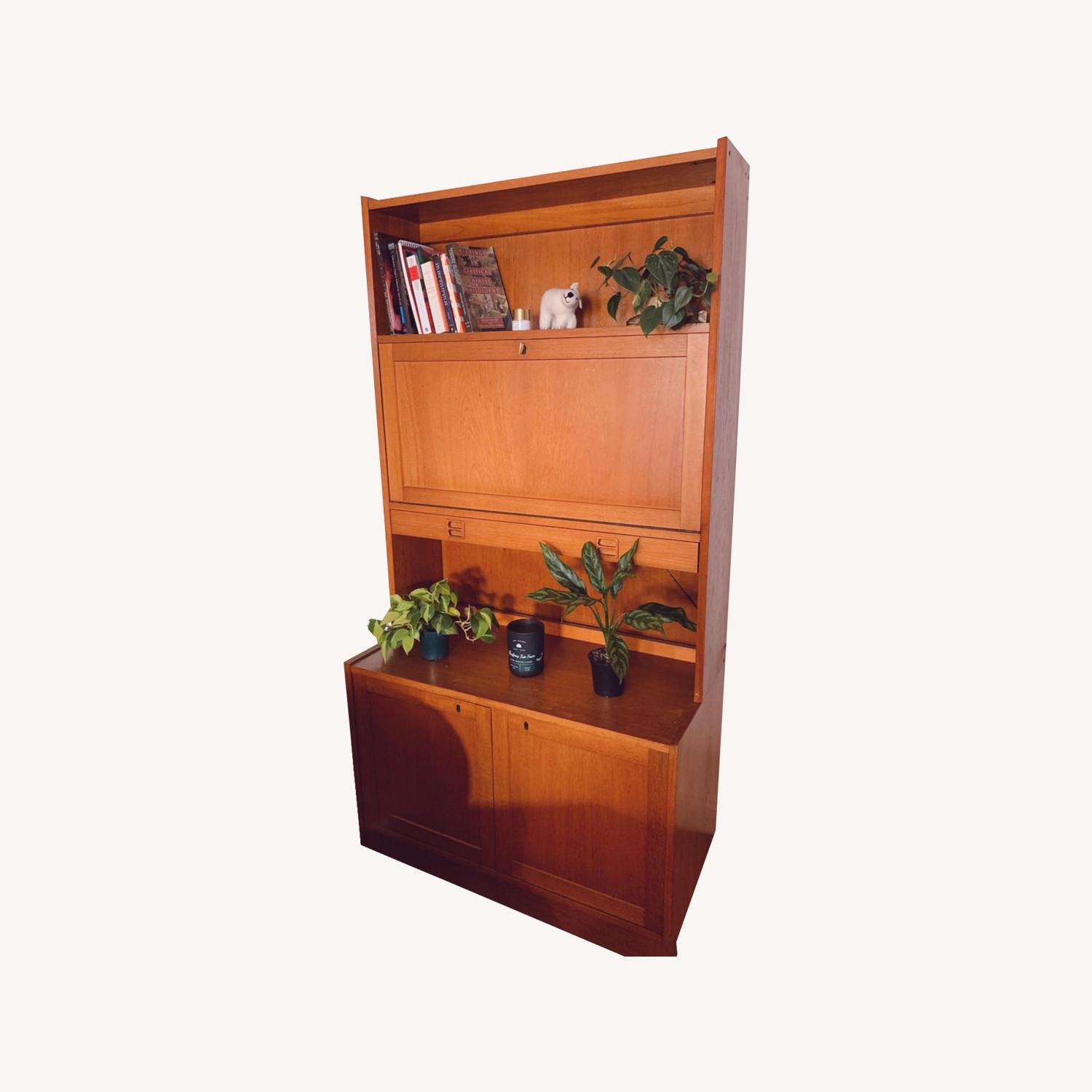 Seller's Notes:Lovely wood vintage mid-century modern (MCM) bookshelf and cabinet combo, perfect for smaller spaces that could use a multi-purpose storage unit! Has been used gently by me for about a year but unfortunately I am moving so can't keep this piece. I used it as a bookshelf, but could also be used as a hutch in the kitchen/dining room area. Features: - Lovely orange/red-ish wood, very 1960s/1970s MCM - Very roomy bottom cabinet with two doors - Two shelf areas - Fold-down cabinet with mirrors that could possibly be used as a liquor cabinet as well - An extra pull out shelf lined in green velvet with pretty Danish MCM style pulls Note: Since this item is vintage, it has normal wear. I've included a photo of the cabinet top where some of the wood finish isn't perfect, but in person it is not very noticeable. The left side of the pull-down cabinet is broken but it does not affect the functionality of the unit at all and should be easily fixable.