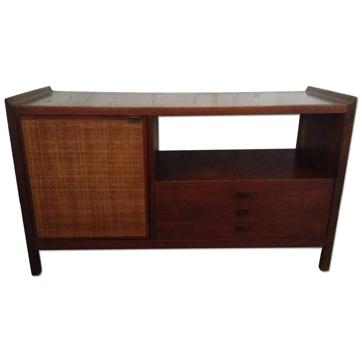 Seller's Notes:Mid-century modern cabinet with walnut, cane and leather. Excellent condition. 18" deep 28.5" tall 48" wide Same model pictured here: https://www.1stdibs.com/furniture/storage-case-pieces/cabinets/id-f_1095130/
