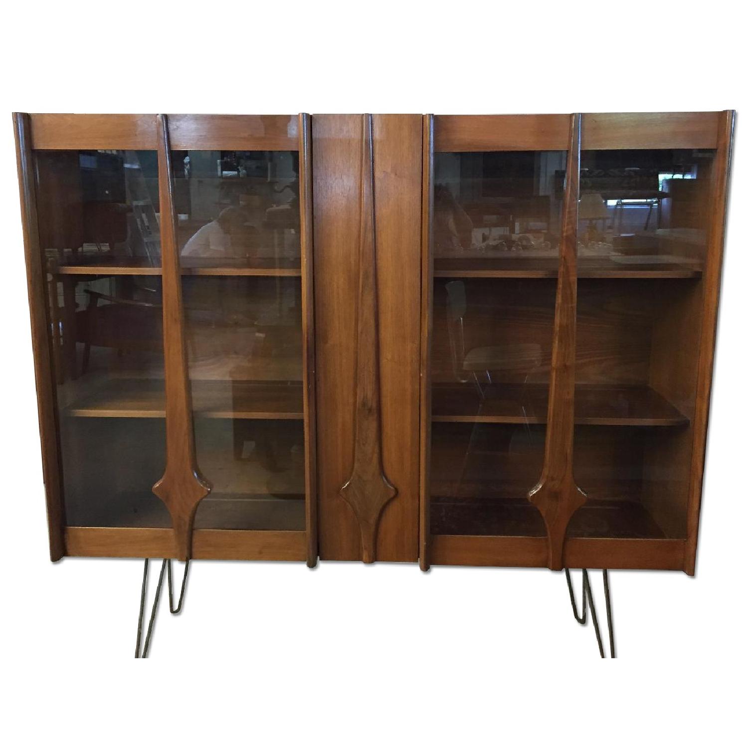 Seller's Notes:This is a re-purposed mid century modern top of a china cabinet that we have put onto hairpin legs. This would make a great storage pantry for a kitchen or bookcase or display for the living room. Shows some minor ware, light scratches that are consistent with its age.