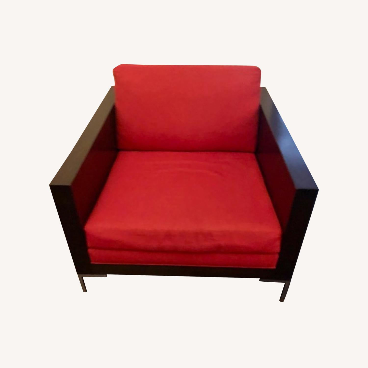 Seller's Notes:Mid-century modern club chair in red. Wood side and chrome legs. Used. Condition moderate. Pick up in NYC only. Will set as set or single piece.