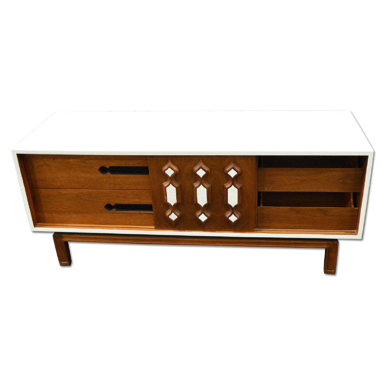 Seller's Notes:Unique credenza / media stand in great condition, with white finish on the outside and some of the decorative details. The two-tone finish gives this piece character and highlights the natural beauty of the wood. 4 total drawers, two large and two behind the sliding door. Unsure of exact age, but it is a beautiful vintage piece.