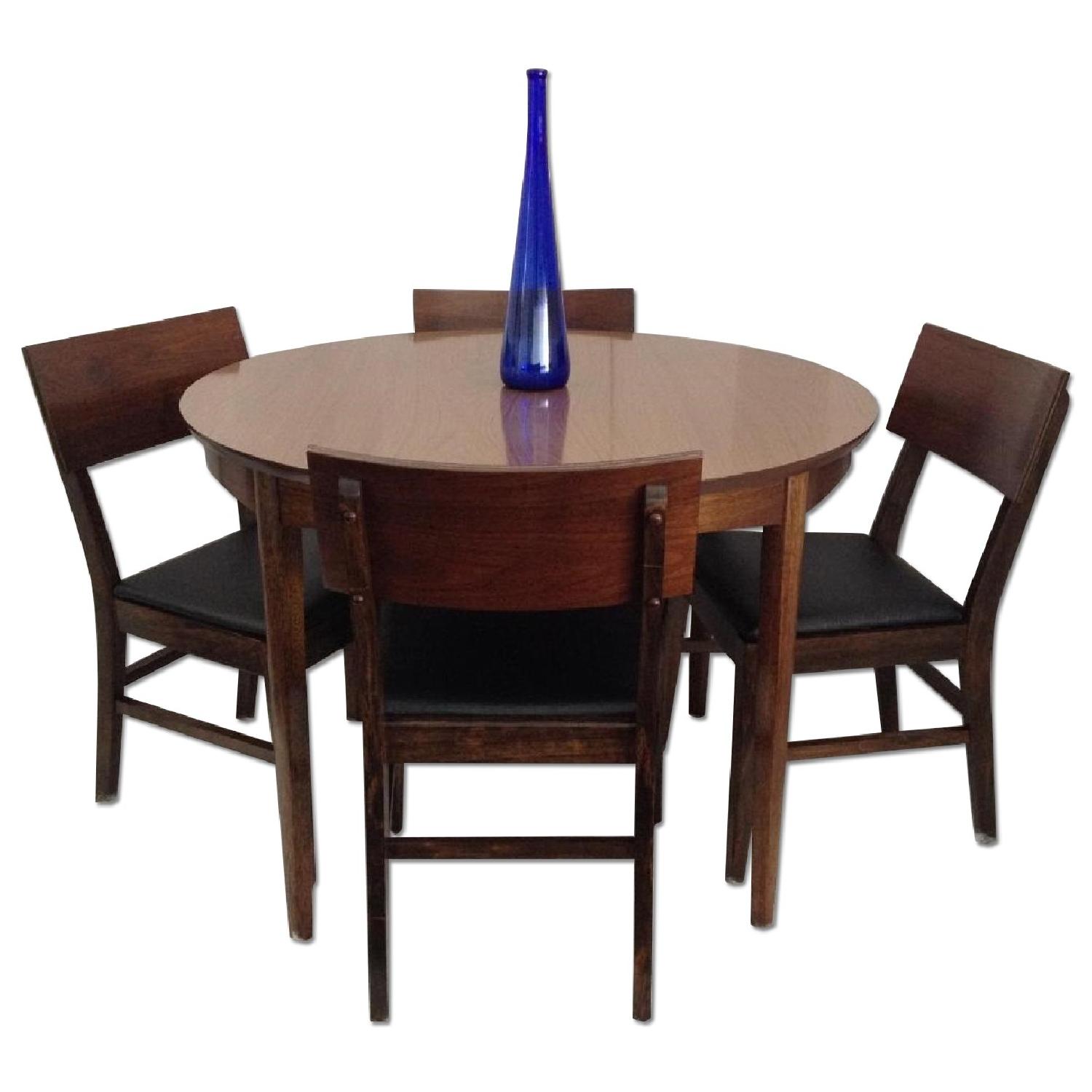 Seller's Notes:Beautiful Rare vintage 1950s era Mid Century Modern Danish style dining table with 3 leaves, and 6 Stanley chairs. 5 side chairs and 1 arm chair. This awesome wood grain durable laminated top round table has 3 leaves and solid walnut tapered legs. The 6 dining room chairs are solid wood with an awesome wood grain pattern. The seats are newly covered with a black vinyl upholstery which is in excellent condition. This Mid Century Modern Danish dining set is solid, very sturdy, and durable. Table Measurements: Diameter 42" 3 Leaves 42" x 11 3/4 each Table w/ 3 leaves 42" W x 77 1/4 "L Chair Measurements: 18"W x 19 1/2" D x 31 1/2" H.