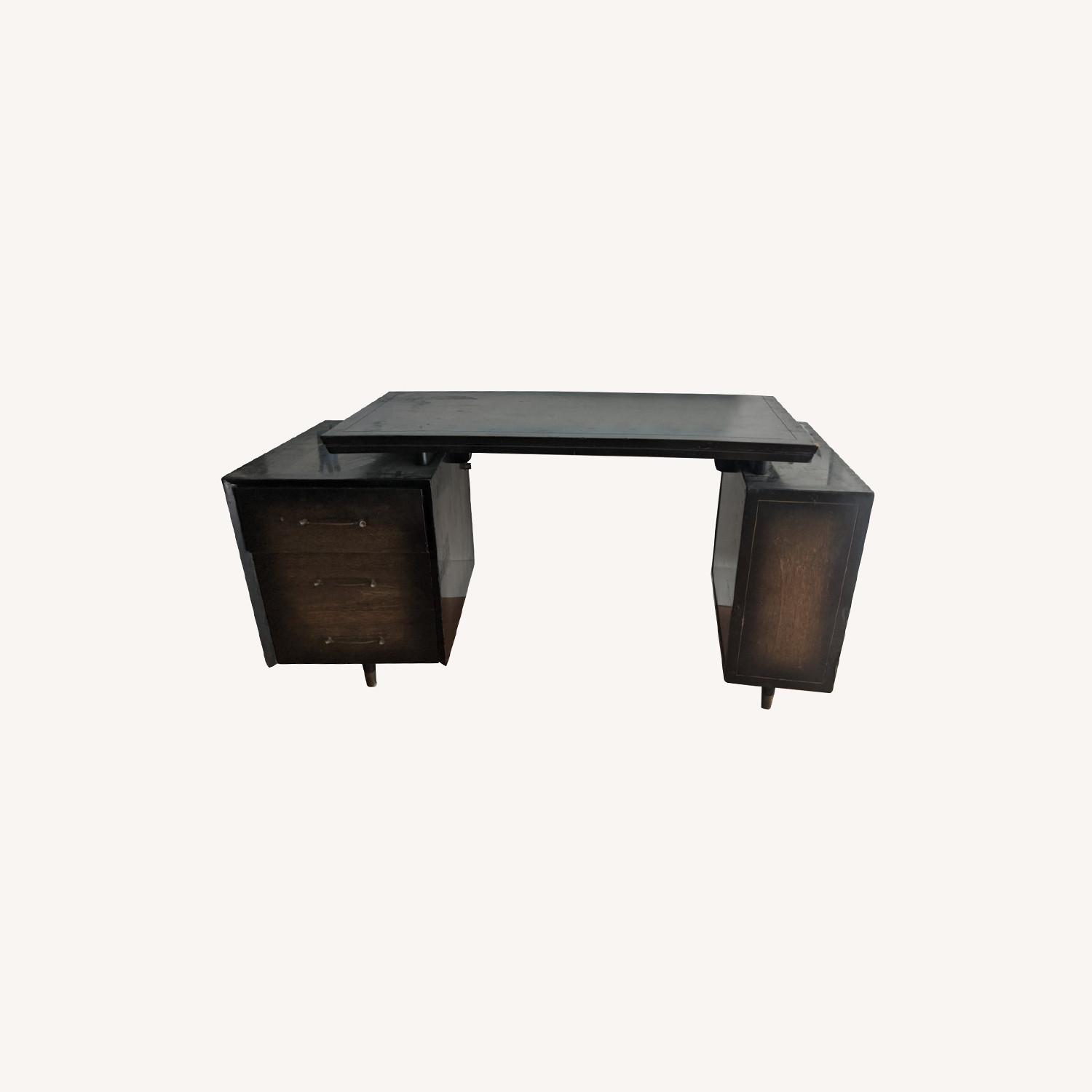 Seller's Notes:Mid-century Modern floating, slightly curved desk in black. The top is in OK condition, but the drawers, sides, and stability are all great. The top could use some TLC, but it is an amazing MCM design and solid wood, comfortable and excellent to work on. See product link for more info