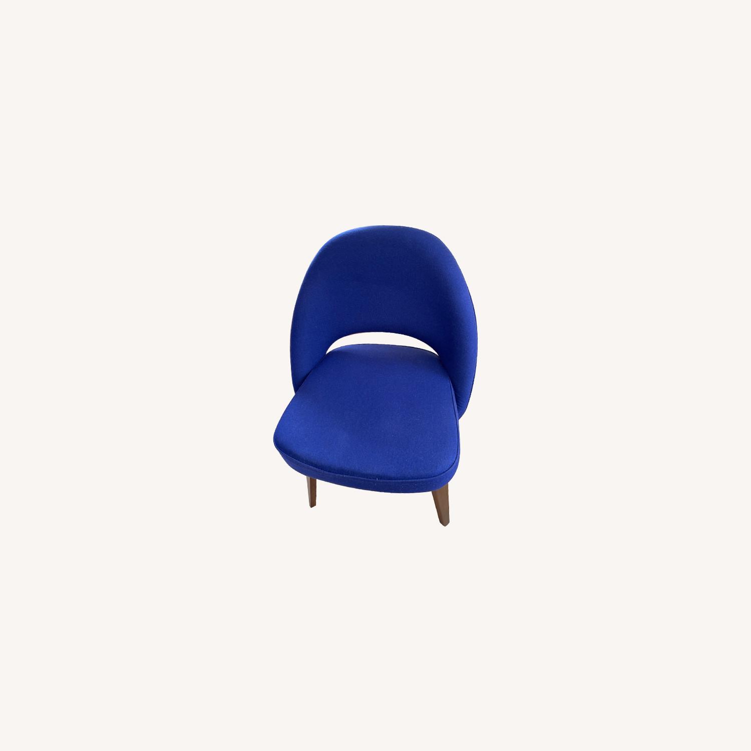 Seller's Notes:Beautiful dining room chair set in Aegan blue felt material, walnut wood legs from Rove Concepts.