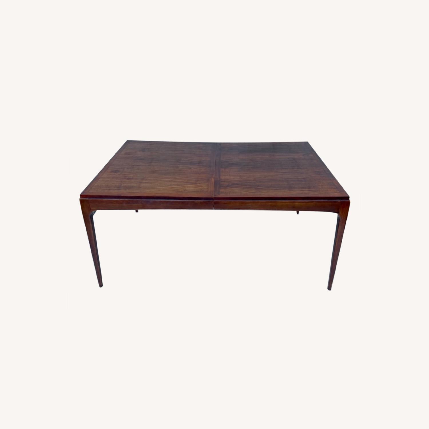 Seller's Notes:This impressive vintage modern dining table from the Lane "Rhythm" line comes with two additional leaves allowing for expansion from 63 inches wide out to almost 100 inches, allowing for plenty of extra seating when needed. The unique rectangular dining table showcases the simple elegance of the mid-century modern era, with choice wood finish and a practical yet stylish design. Matching cane back chairs also available- sideboard as well! Dimensions: 63-99w 40.5d 29h Condition: age appropriate wear, vintage finish worn, scuffs/scratches, edge wear, chips, some fading/blemishes, see photos-