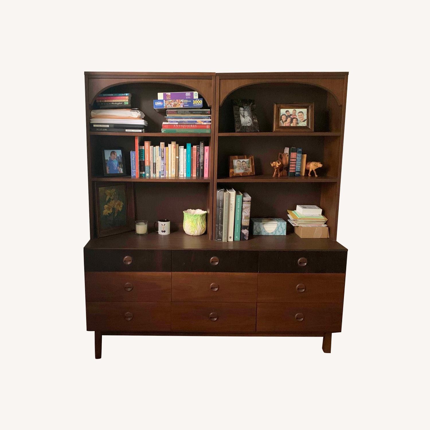 Seller's Notes:Beautiful two tone finish mid-century modern dresser with detachable book shelf. In good vintage condition. 64" long, 18" deep, 72" high