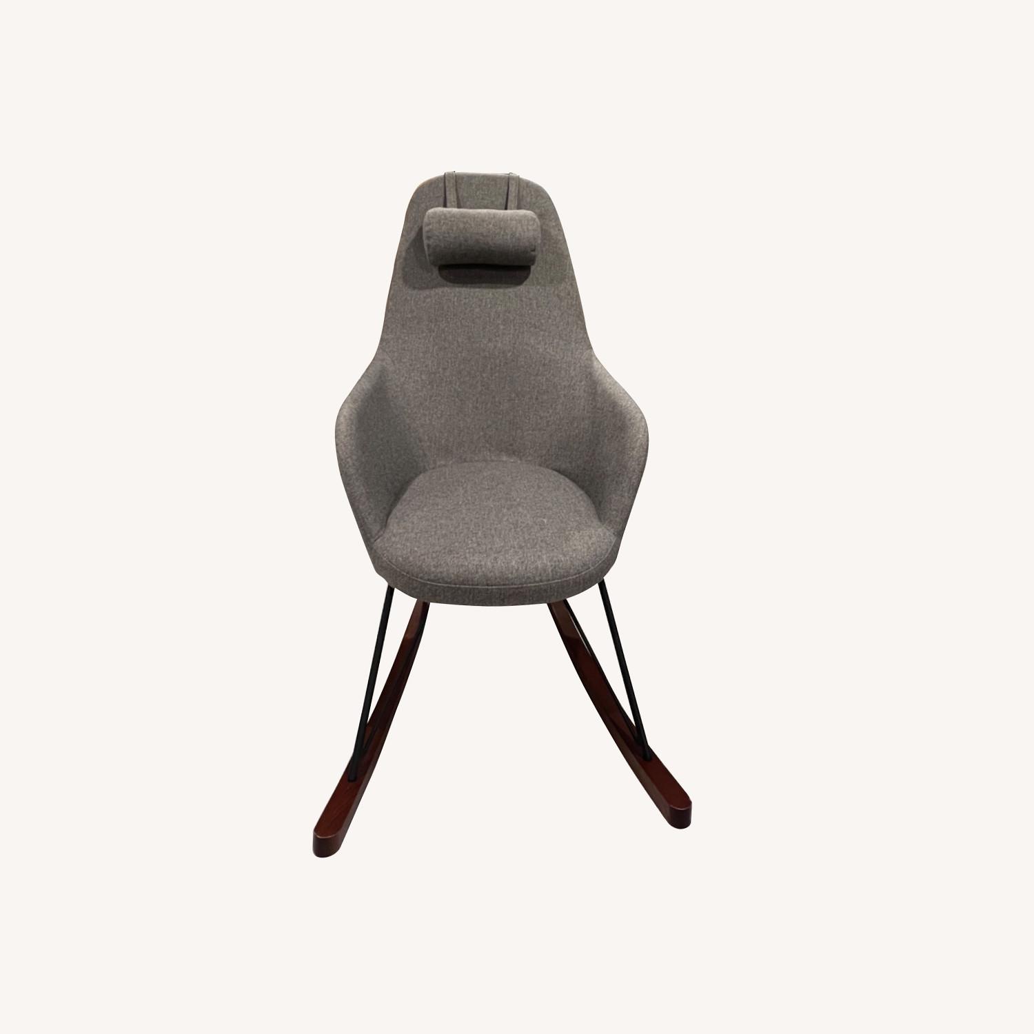 Seller's Notes:Grey herringbone rocking chair. — in great condition!! This chair is very comfy and was used in a nursery. No stains but the legs have some scratches - see pics Adjustable head/neck pillow Wood rocking legs Total Height = 43.75” Rocking chair depth (leg length) = 39” Width = 25.5” Seat back height = 31” Seat width = 17.5” Seat Depth = 20.5” See less