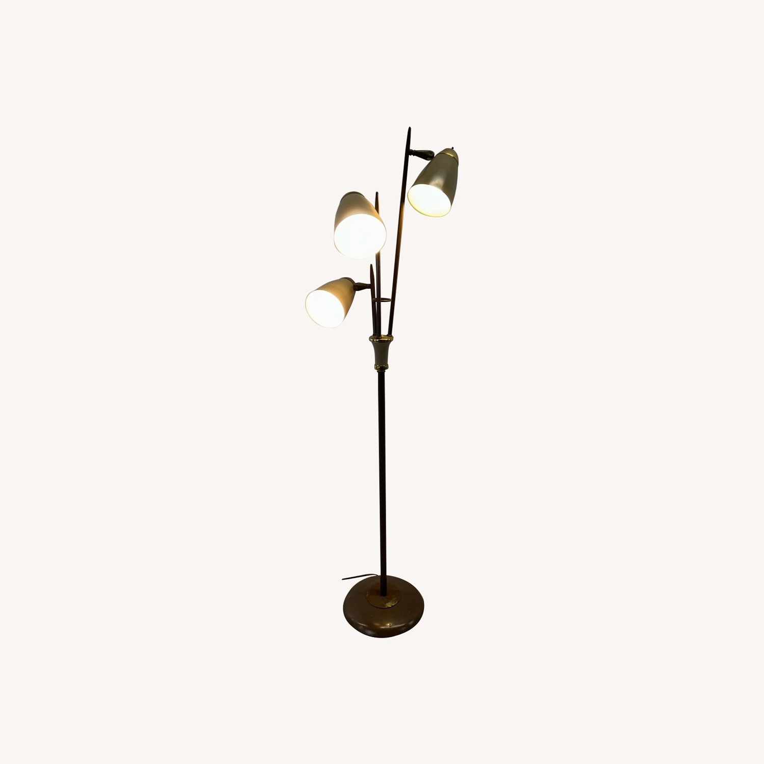 Seller's Notes:This mid century modern floor lamp features brown painted metal base with three brass accented bullet shades. Each bulb can be controlled separately with its own switch. Base measures: 11w 11d Dimensions: 21w 21d 61h Condition: Metal base and shades have some oxidation. Paint has some scuffs and scratches. The original wiring works. All wiring is intact and functional. Cord is original, two prong. 7/10 The vendor has confirmed this piece is in working order.