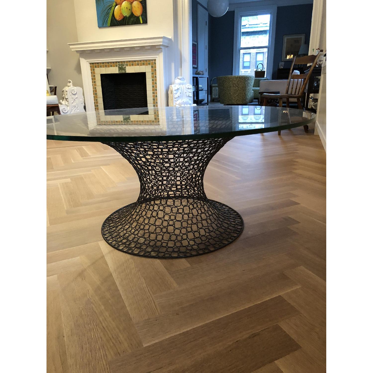 Seller's Notes:CB2 mid-century modern style coffee table. Has a light weight (easy to move) steel base and a clear glass circular top, 40 inch diameter. The base and top do not attach so it is an easy to move item. In beautiful condition.
