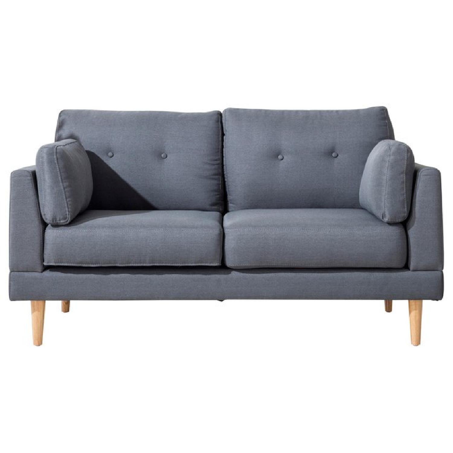 Seller's Notes:This mid-century modern loveseat features tufted cushion details, a solid wood frame, and a soft linen fabric upholstery. The natural finished wooden legs complete the retro look and two accent pillows make this plush loveseat an inviting piece for any space. Details: Loveseat with 2 accent pillows Mid-century modern design Button tufted back cushions Linen fabric upholstery Light grey or dark grey options Natural wood legs Removable and washable covers Assembly required Dimensions: Overall: 59 inches wide x 33 inches deep x 33 inches high Seat Depth: 21 inches Seat Width: 49 inches Seat Height: 18 inches