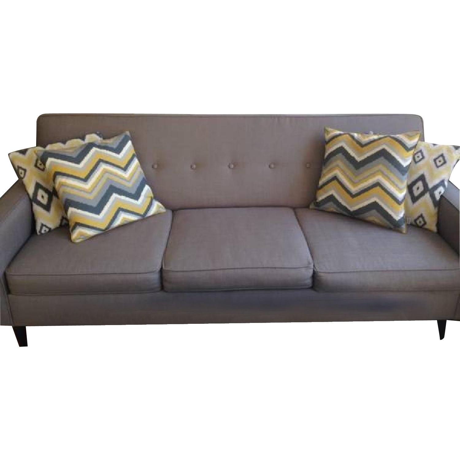 Seller's Notes:Beautiful mid century modern grey sofa (exact color is 'platinum'). Bought from Macy's in April for $899 + $100 shipping. Like new! In a large elevator building for easy transportation. Button detailing, track-style arms, and espresso-finished legs. Dimensions: 82"W x 37"D x 35"H