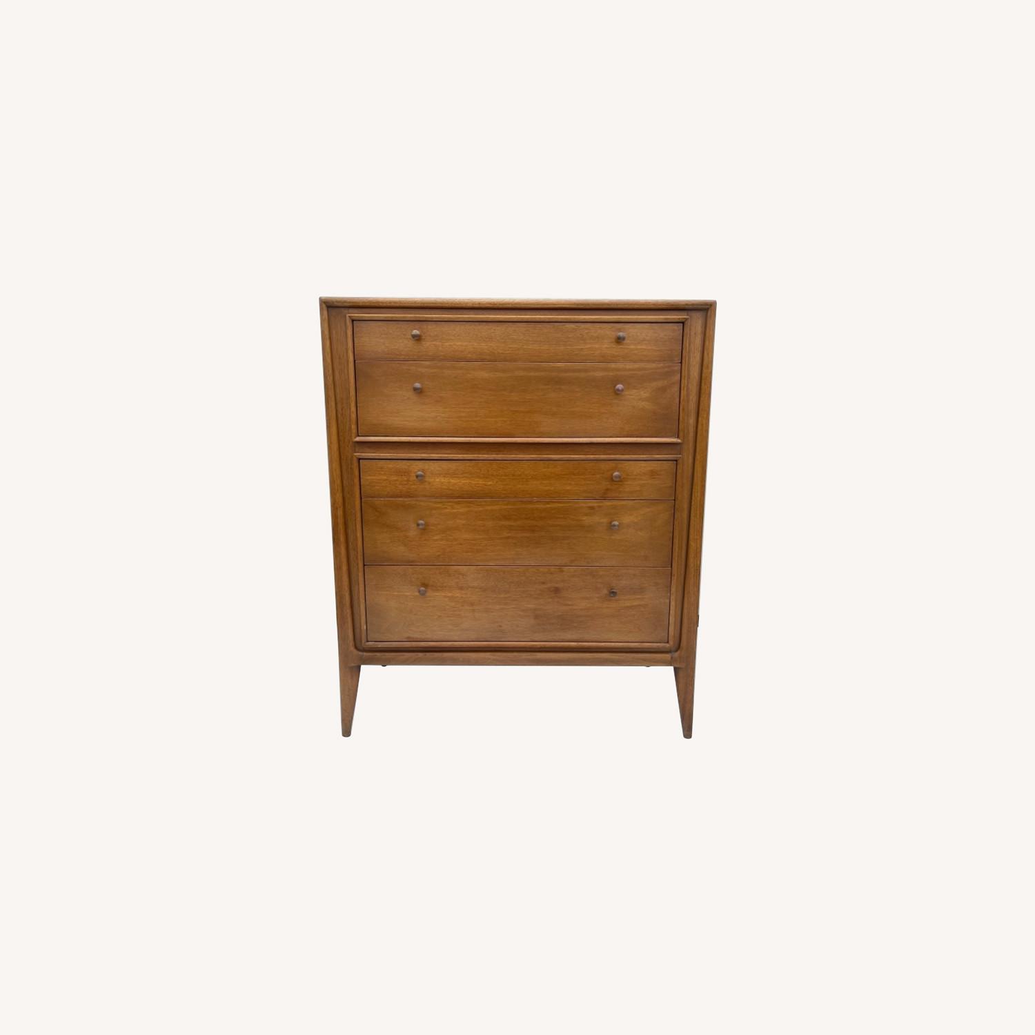 Seller's Notes:This mid-century modern highboy dresser from the John Stuart Inc "Facade" line features five spacious drawers with graduated sizes, vintage walnut finish, and clean modern lines. Perfect tall dresser for bedroom storage- Dimensions: 38w 19.5d 45.5h Condition: age appropriate wear, vintage finish worn with loss, discoloration, edge wear, dings, chips, interior marks, drawers slide worn, pulls askew, see photos