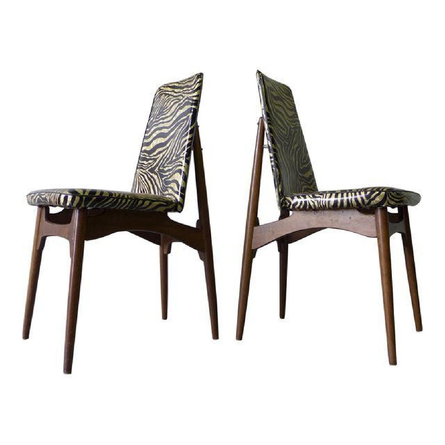 Seller's Notes:Mid Century Modern Kodawood Chairs in lustrous zebra pattern upholstery. Sleek frame design. Solid + sturdy. Price is for the pair. Measurements: 35"/back height x 17.5"W x 21"D