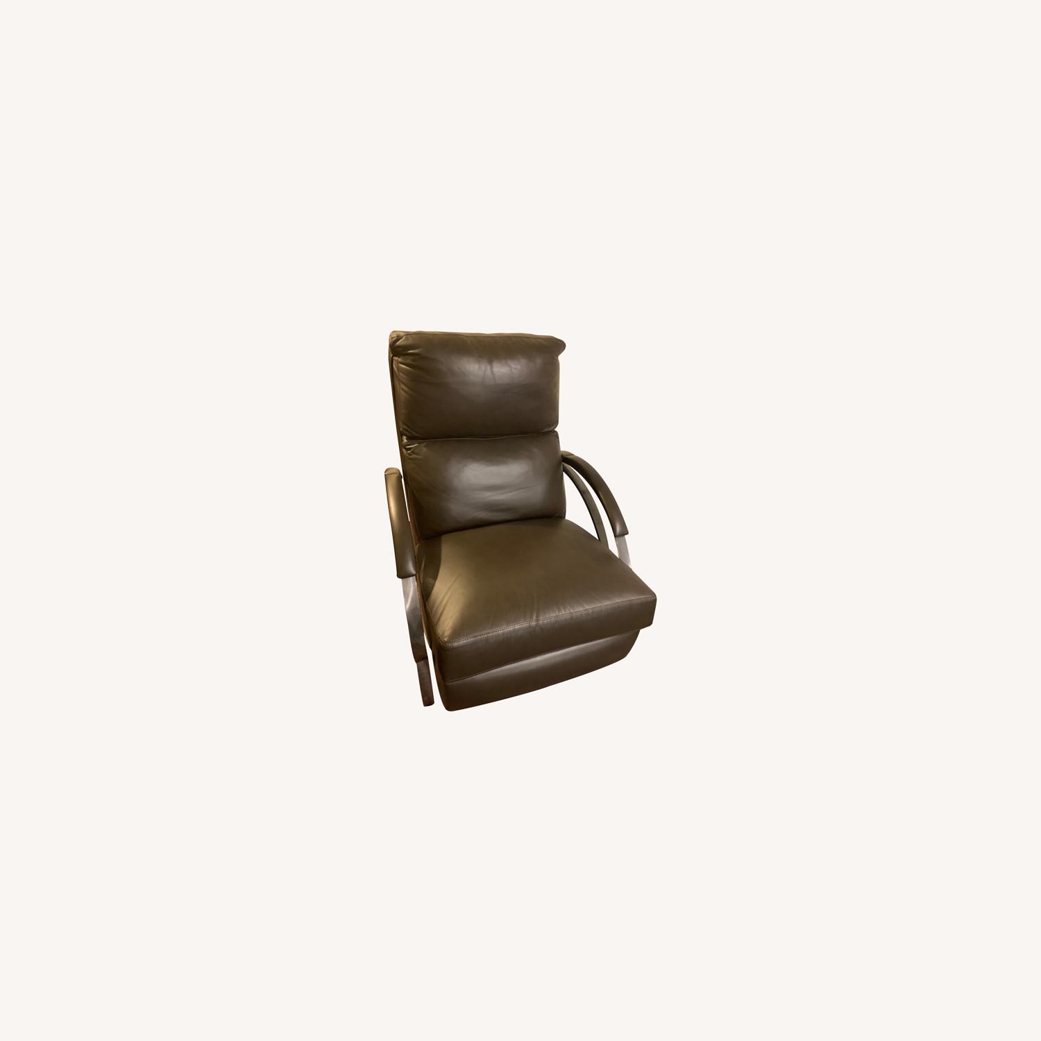 Seller's Notes:Stunning super cool mid-century modern reclining leather chair. Perfect condition and extremely comfortable! Sturdy construction with awesome chrome details and olive green leather. Attributed to Design Institute of America, selling online for thousands $$$. 29”w x 28” h