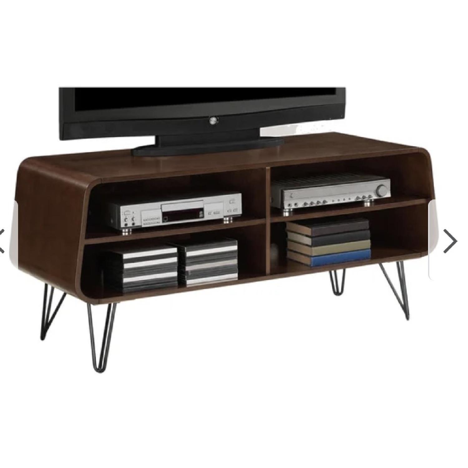 Seller's Notes:https://www.overstock.com/Home-Garden/Carson-Carrington-Astro-Media-Center/7501954/product.html#details Just moved and this doesn't fit in our place. Bummer because it's beautiful and in perfect condition. It's nearly new but not within the package, but AptDeco doesn't have an option for that. The first two photos are from the website listing so you can see what it looks like when it's properly staged; the third and fourth are of the actual item in my apartment (sorry it's a mess from moving). We had this under a mounted TV and stored books and board games in it. You can see there are circular cut-outs in the back designed for cord management. It's simple and beautiful and a shame they don't make it anymore!