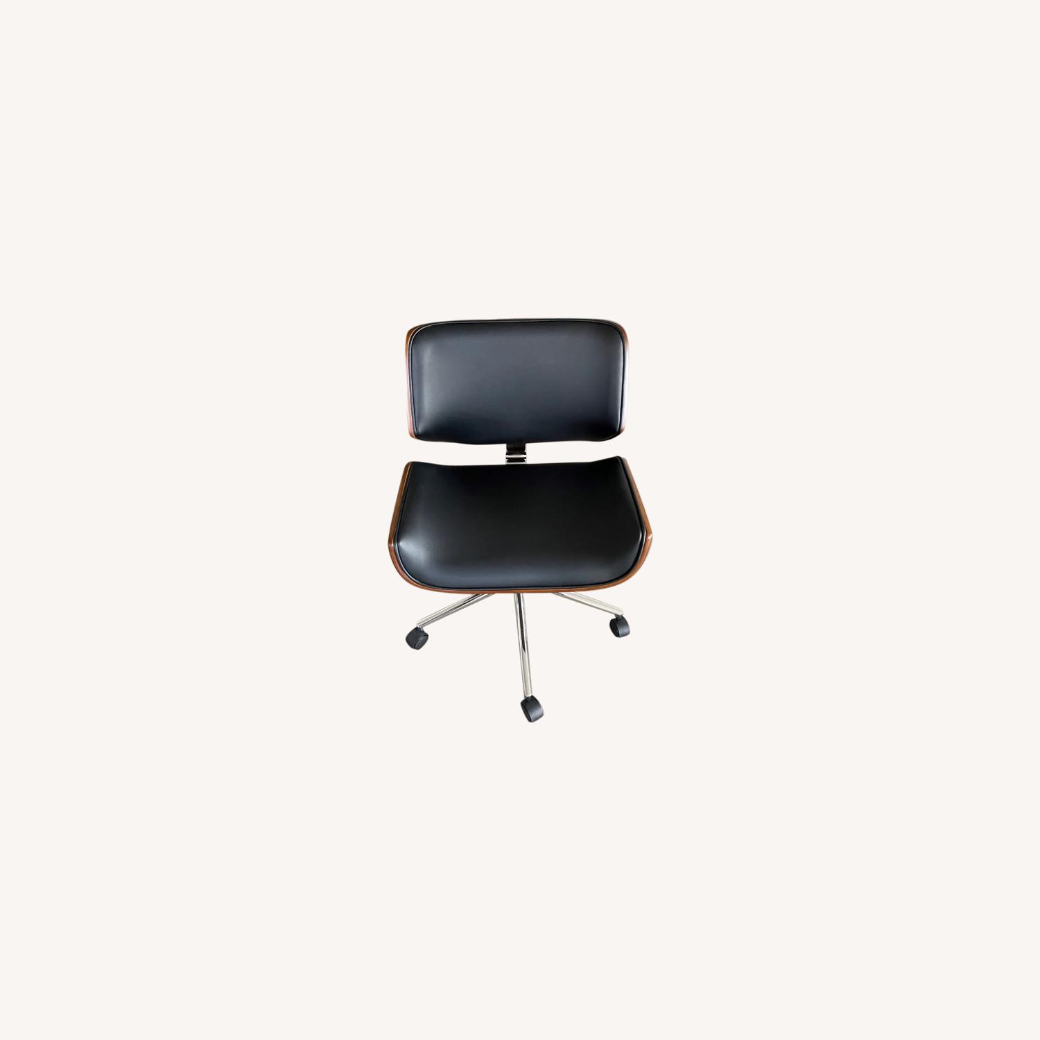 Seller's Notes:Purchased from All Modern and it's no longer in stock. Mid-Century modern, Eames-inspired, office chair. Faux black leather seating and back. Wood finish underneath and on back. Swivel seat with lever to adjust seat height. Wheels on silver base. Very study construction.