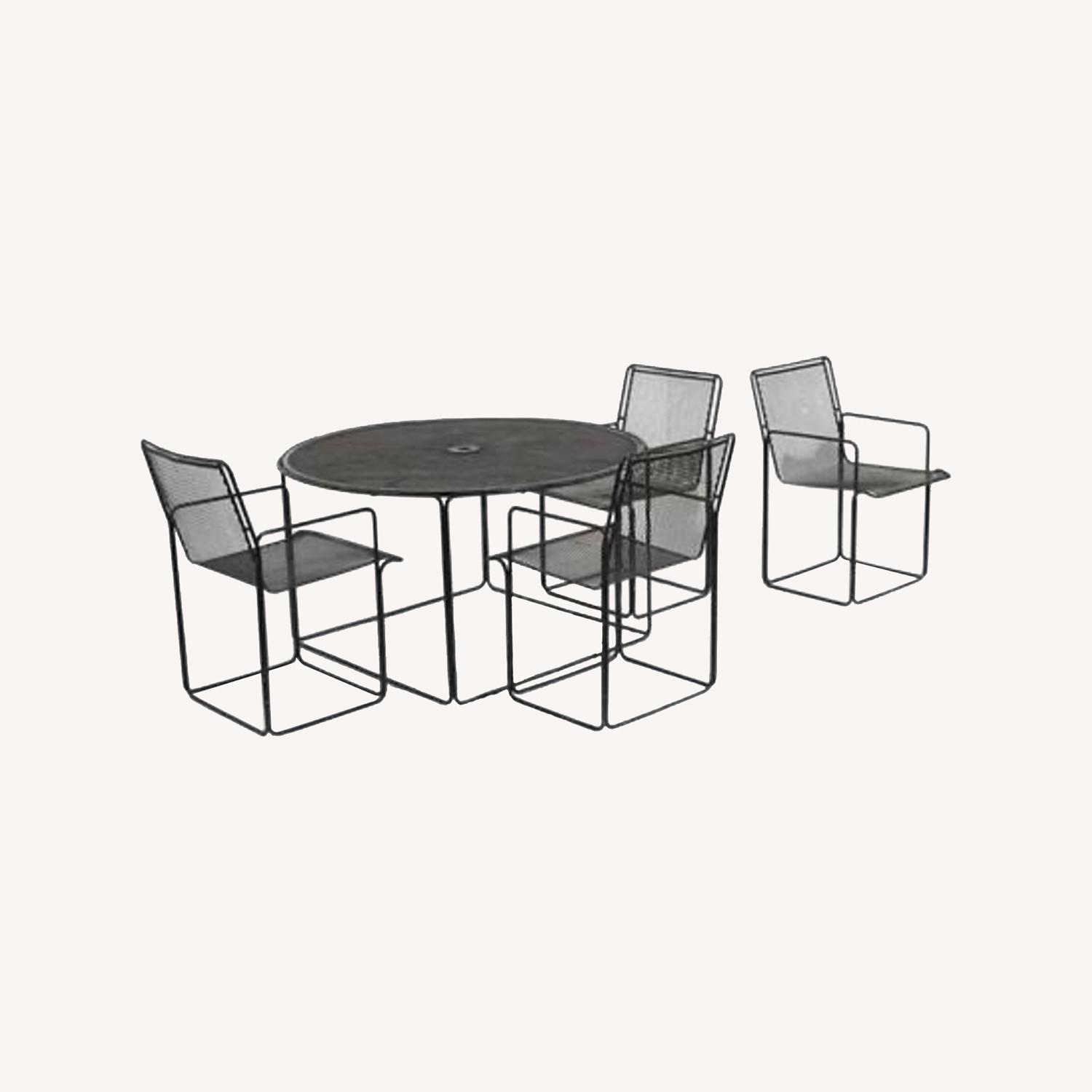 Seller's Notes:Exceptional modern 70's / 80's style iron dining table and chairs set. Rare cube style frames in heavy solid iron rod with expanded mesh seats and table top. Recently refinished in heavy duty primer and 3 coats of exterior grade satin black paint. New rubber feet protectors on chairs and table. Chairs - 33" h x 20" w x 19" d Table - 27" h x 49" dia