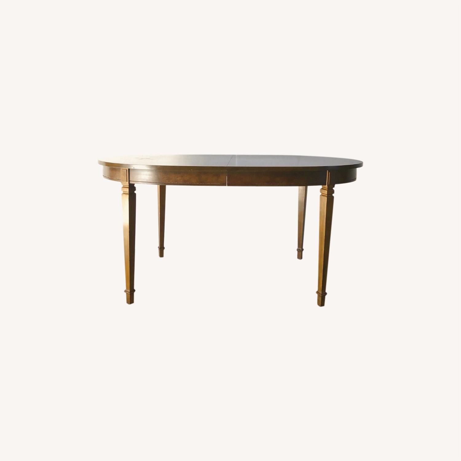 Seller's Notes:This mid century modern dining table features original walnut finish, oval shape and removable solid wood legs. Matching set of 6 cane back dining chairs available separately. Dimensions: 54w 16d 80.5h Condition: Original walnut finish is in excellent condition. Only slight scuffs, minor scratches, and light edge dings consistent with age and regular use. Unfortunately there is no leaf included in this sale although the table is able to support one (it opens). 8/10 - please confirm item location (NJ shop / NJ warehouse) before scheduling pickup -
