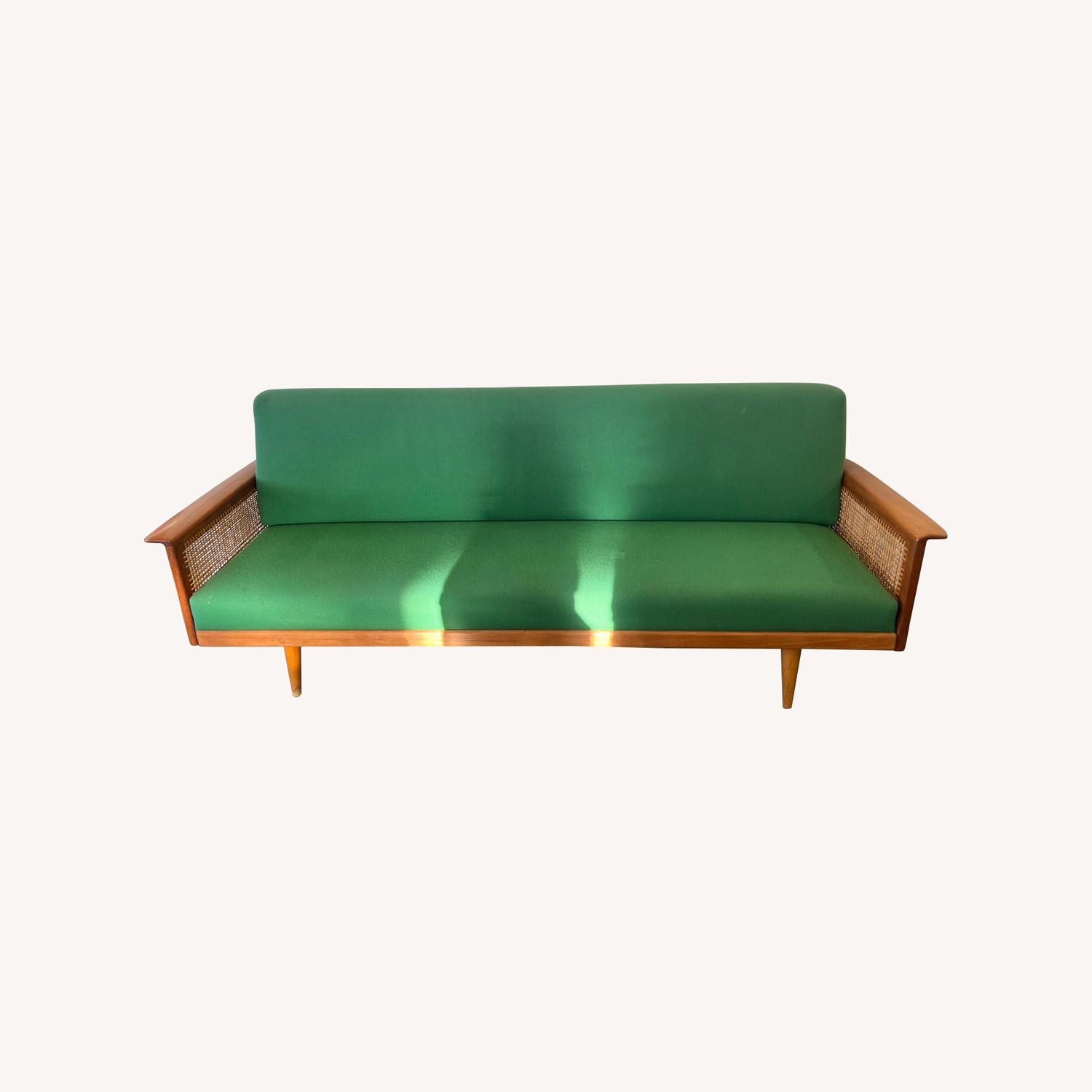 Seller's Notes:Mid Century modern cane and fabric sofa. Good shape overall, has minor stains that can easily be cleaned as the covered are fully removable with zippers. The canning needs repair on one side. Stylish mid century modern design, showing signs of ware that can easily be restored.