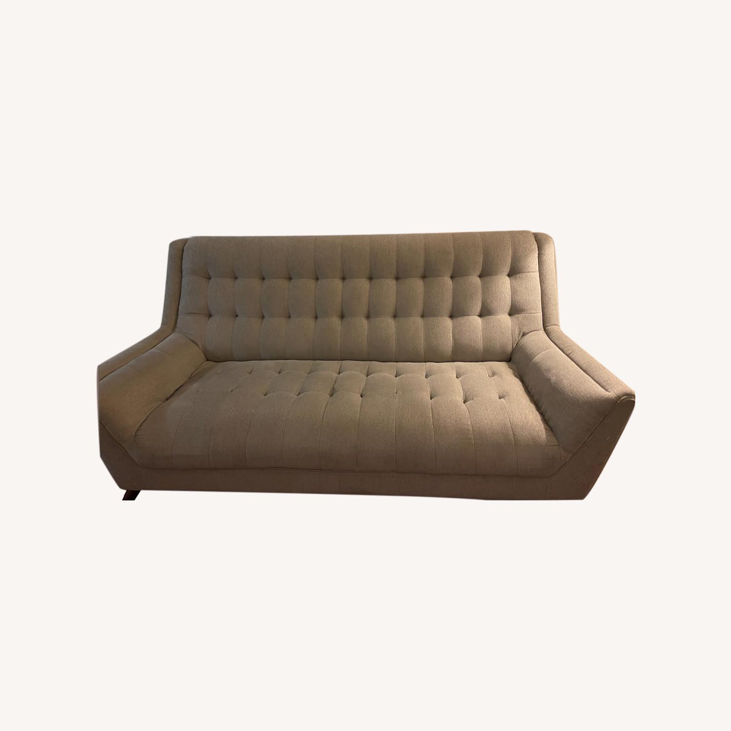 Seller's Notes:Mid century modern style sofa light gray color with wood feet has some where in tear and small area that has been stitched (photo added). Pick up only and must sell by 2/18. Selling two matching chairs. Please let me know if your interested for both and will take BO.